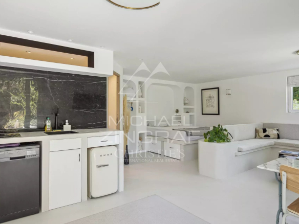The villa has seven bedrooms, including a self-contained apartment with a kitchenette, shower room, and private terrace, as well as an en-suite studio apartment, perfect for accommodating family or guests with complete independence. An office and a laundry room complete the functional spaces of the house.