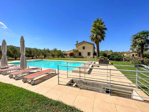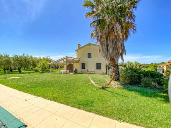 The property comprises a villa of approximately 350 m² on two floors, divided into three separate apartments. The first floor houses the main apartment, consisting of a living room with a fireplace, a kitchen, three double bedrooms, a bathroom, and a utility room. The ground floor contains an apartment with a kitchen, a living room, a bathroom, and a double bedroom with an en-suite bathroom. Also on the ground floor is another apartment with a living room with a kitchenette, a double bedroom, a single bedroom, and a bathroom. The 5000 m² garden surrounding the villa is fully fenced and includes a 20 x 12 meter swimming pool and a separate annex, which offers the possibility of building an additional 80 m² extension.