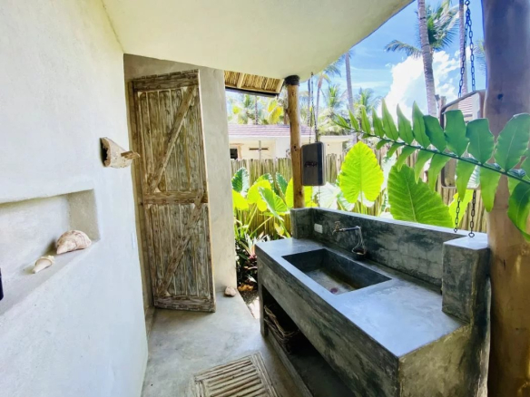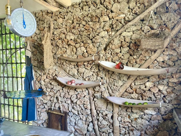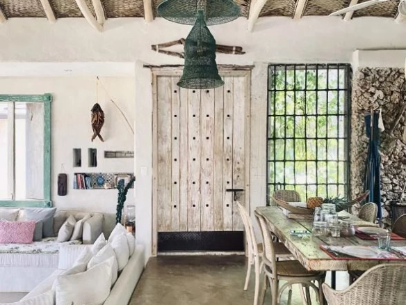 In addition, the eco-friendly seaside retreat features a tropical garden with a courtyard, a chicken coop, and an orchard of various vegetables.
