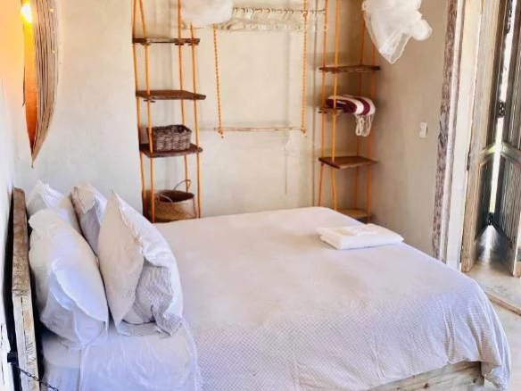 The eco-friendly seaside retreat was built in 2019 on 2,460 square meters. The 3 independent bungalows, the 1 apartment and the service area with warehouse, laundry room, technical room plus garage, workshop and gazebo measure a total of 350 square meters.