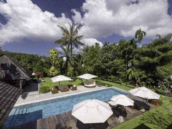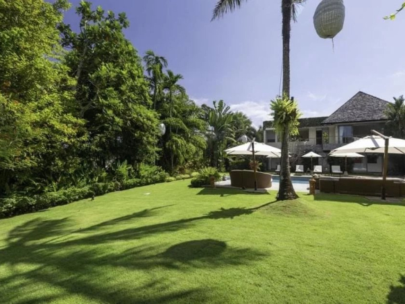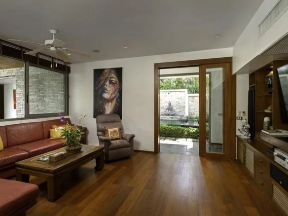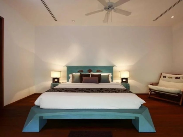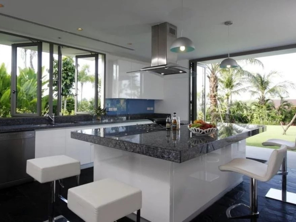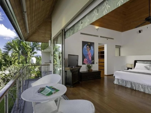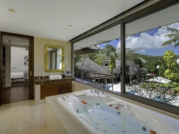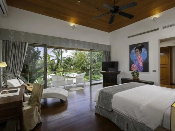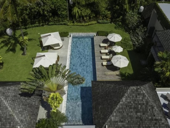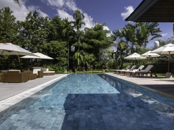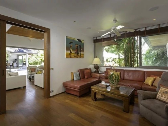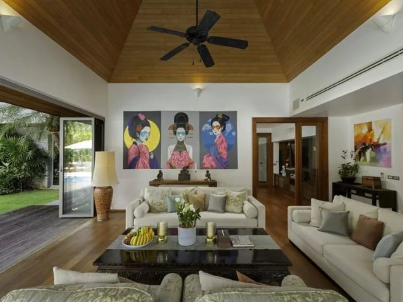 The villa is 750 square meters and decorated in a modern Thai style. It features teak and granite floors and a fully equipped modern kitchen. Connected indoor and outdoor spaces, a stunning 22-meter swimming pool, and lush tropical landscaped gardens offer the perfect balance between a secluded and exciting family retreat and a fantastic setting for family gatherings and special events.