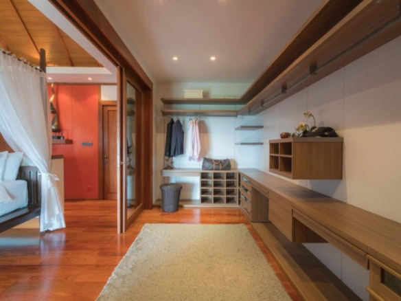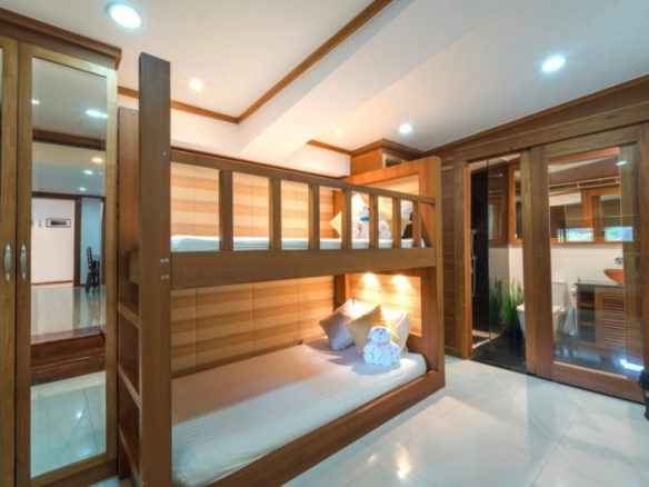 On the lower level is the living room, which flows seamlessly into the infinity pool. This level includes a dining room, a living room, and a covered terrace with a lovely plunge pool. There is also a kitchen, a bathroom, an office/library, and a bedroom with an en-suite bathroom and built-in oversized bunk beds, which is ideal for teenagers or children. The living room is tastefully decorated and furnished with Thai antiques.
