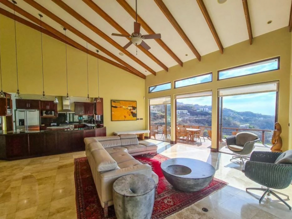 Vaulted beamed ceilings and floor-to-ceiling windows make the bay and buttresses an integral part of this living space. The main room is open plan with a gourmet kitchen, dining room, lounge/lounge area and patio doors leading to a large wooden deck and infinity pool. The kitchen is a cook's delight, with a kitchen island, all stainless steel appliances, a large range hood, granite and marble countertops, and plenty of counter space and storage. The dining room has a long Guanacaste wood table to accommodate dinner parties or large family dinners. Soft leather sofas complete the lounge/lounge, which can be expanded by opening the patio doors onto the wooden terrace, an ideal space for al fresco dining, a grill or the place to enjoy your favorite drink and admire the sunset.