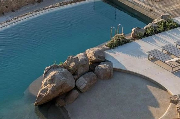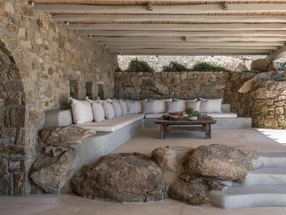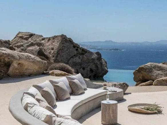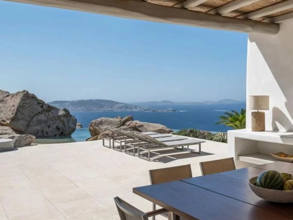 The expansive outdoor terrace offers 180-degree views of the sea, Mykonos Town, and the sunset. It also features a zero-entry infinity pool with built-in rock formations – a unique feature that further enhances the property's immersive nature. Large pergolas and inviting private alcoves provide additional spaces for relaxing and dining al fresco while enjoying the view.
