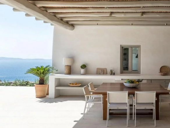 The interior spaces are decorated in a minimalist style, featuring original paintings, textiles, and other details chosen by the owners. The overall ambiance is one of simplicity and tranquility, with a neutral color palette and natural materials used throughout the villa to create the perfect setting for relaxing while gazing at the endless blue of the Aegean Sea. With Mykonos Town and the island's most popular beaches just a short drive away, it's the perfect base for enjoying moments of retreat and privacy without sacrificing access to all the best dining and entertainment options the island has to offer.
