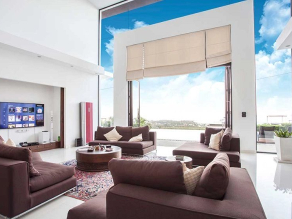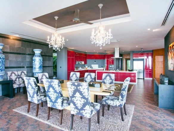 Spread over two levels, the villa has an extremely spacious interior with 900 m2 of internal living space including 6 bedrooms, a living room with a double-height ceiling, a huge open kitchen and dining room, and a vast terrace with a large pavilion for outdoor dining.