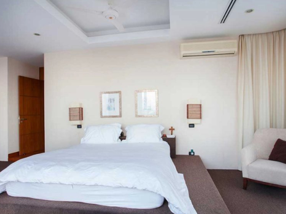 There is an office and 3 other bedrooms on the upper floor. The largest has a kitchenette and accordion doors that fold completely back to reveal a sensational view of the sea and the island.
