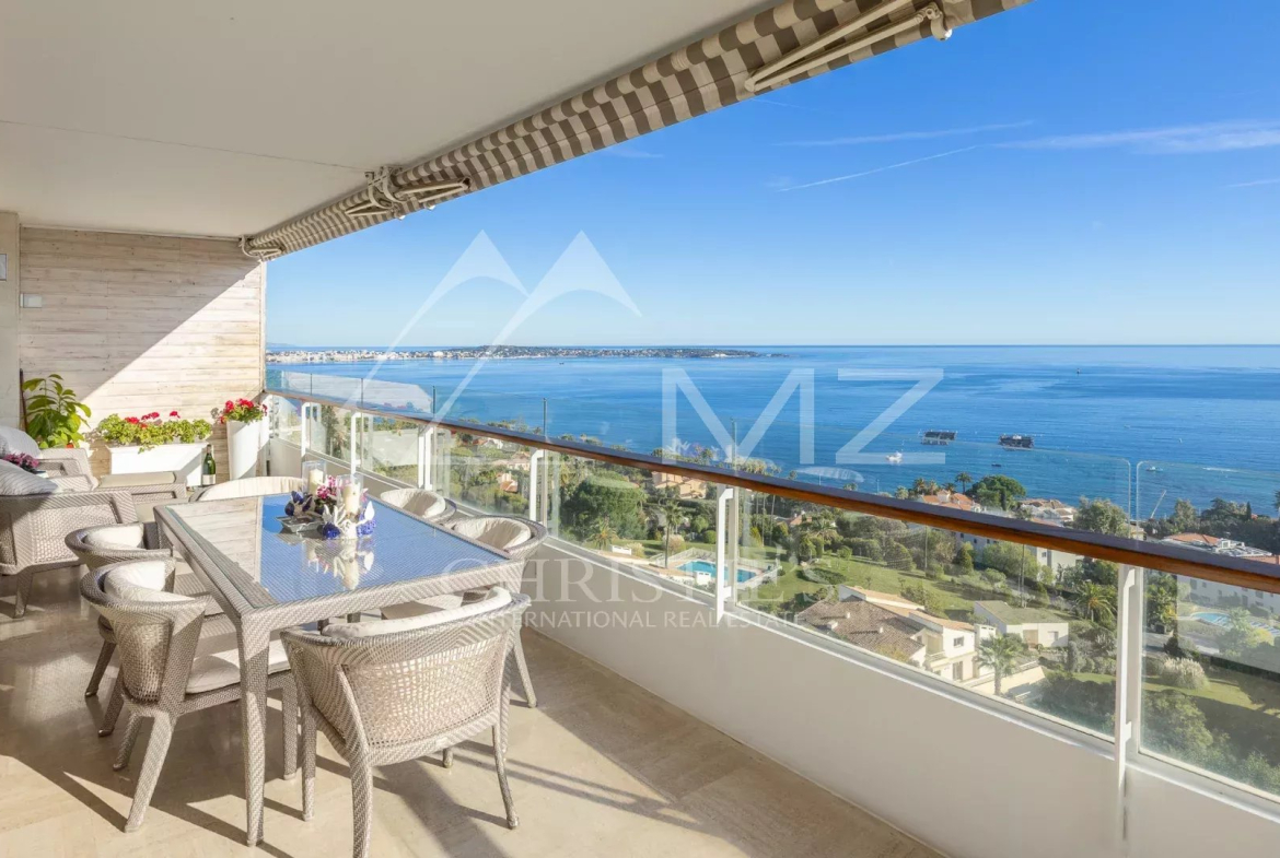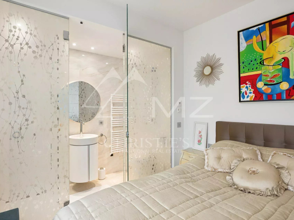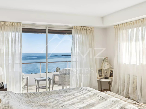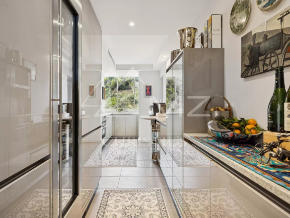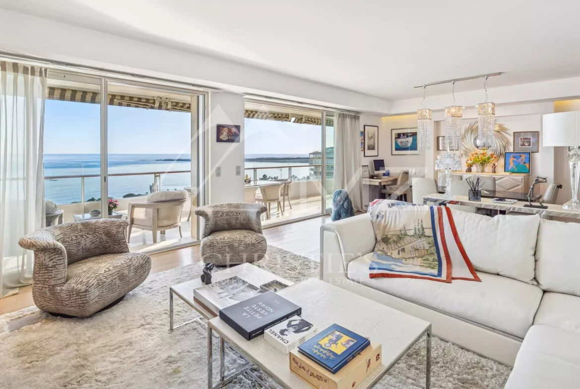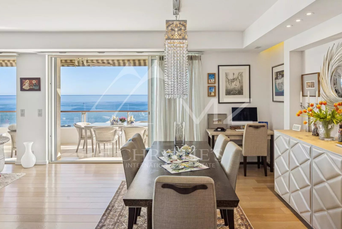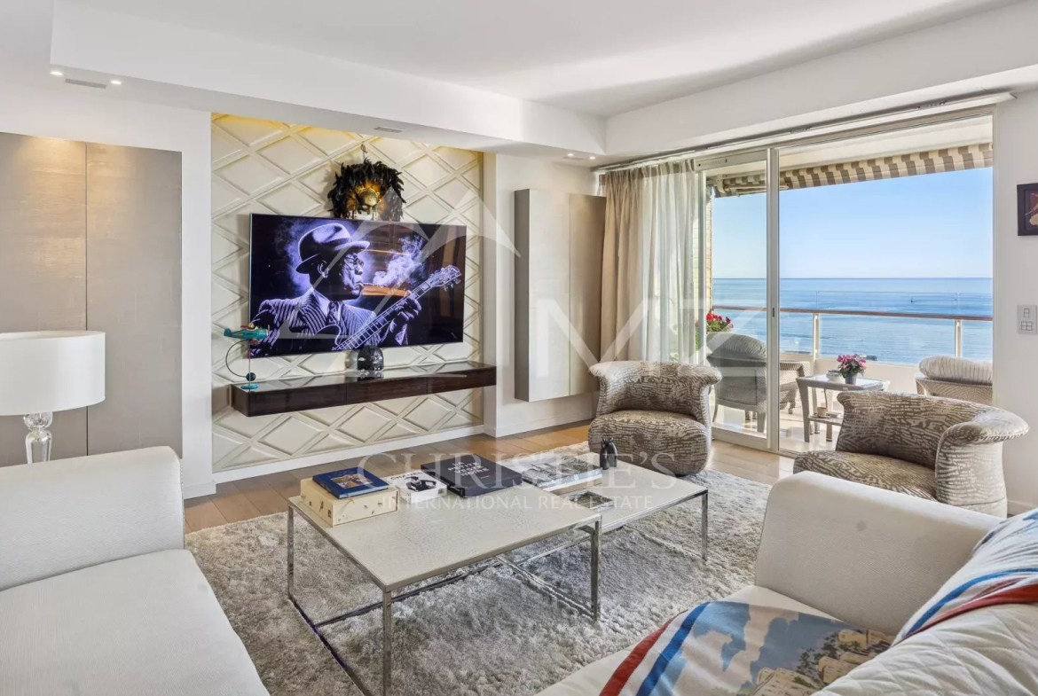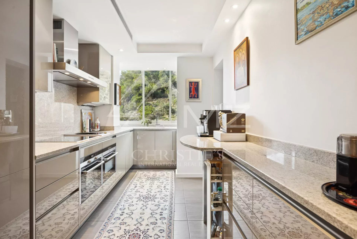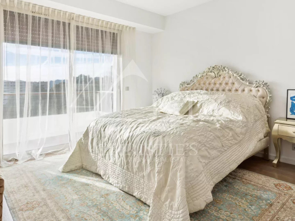 This corner apartment, located on a high floor, spans approximately 138 square meters and is distinguished by its spacious, light-filled living room, opening onto a 47-square-meter corner terrace with breathtaking panoramic views of the Mediterranean Sea. The absence of overlooking neighbors ensures complete privacy, while the parquet flooring and high-quality contemporary finishes add a touch of elegance.