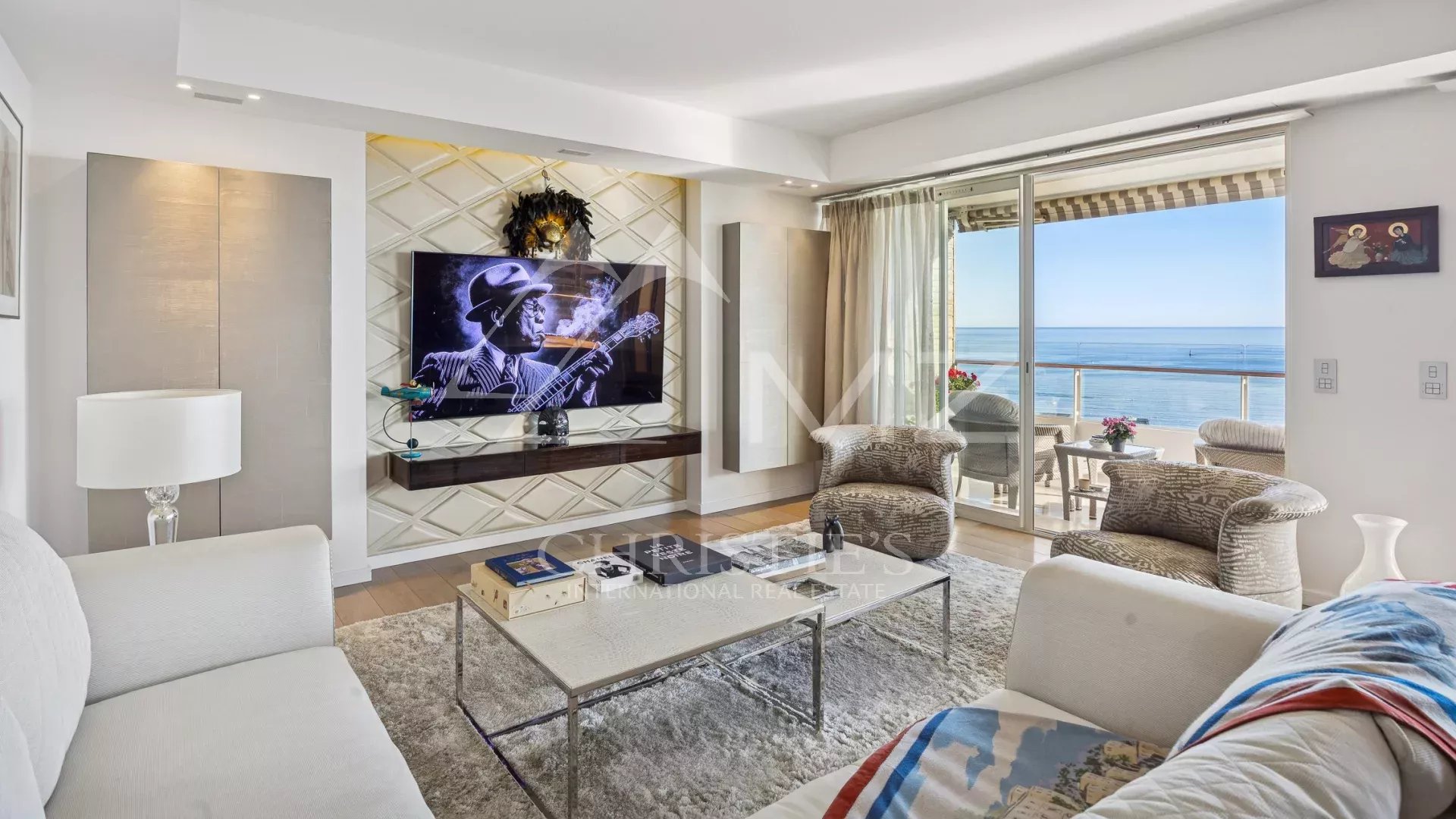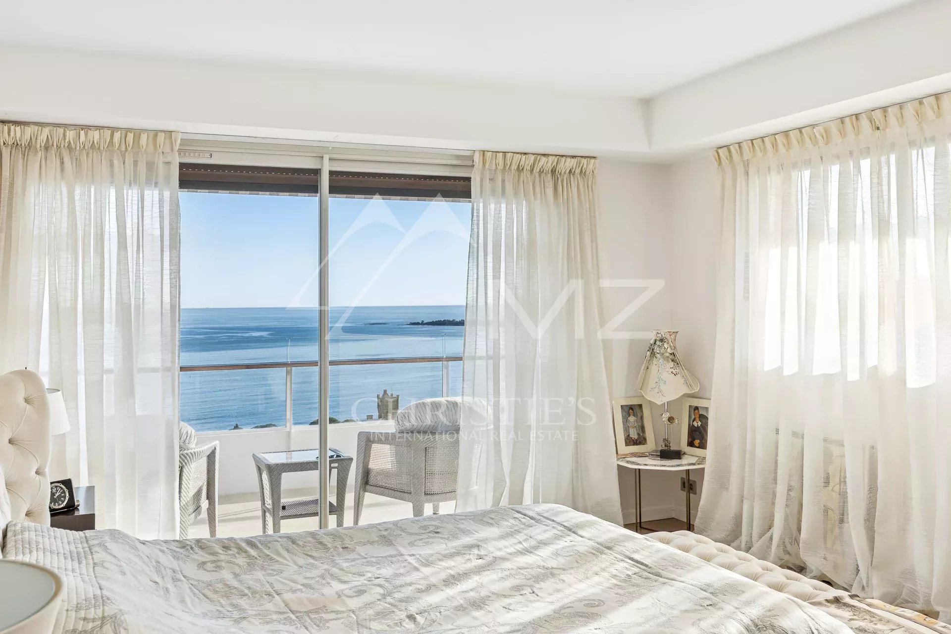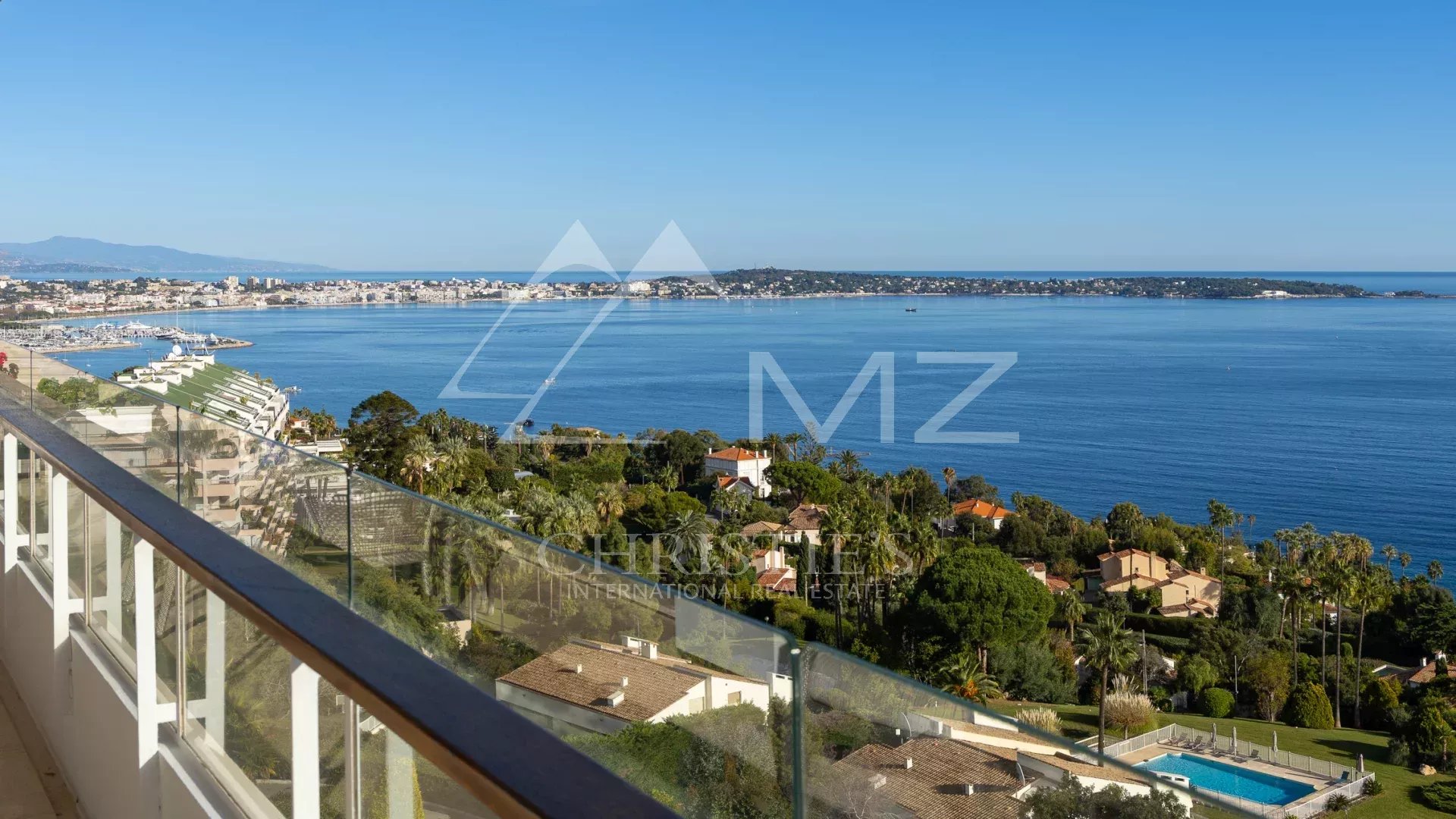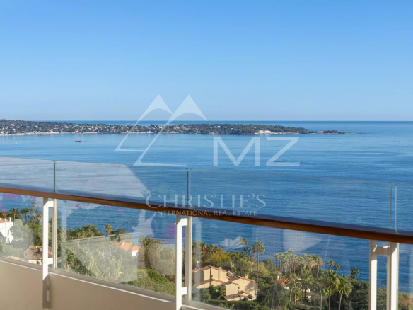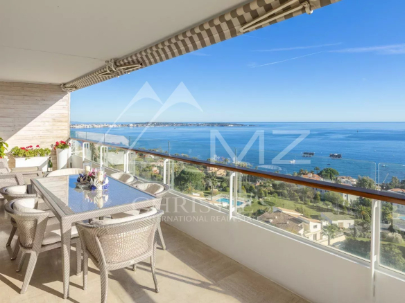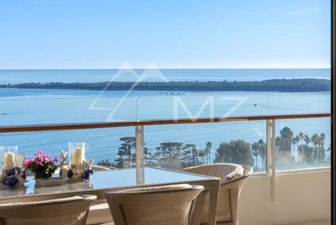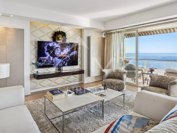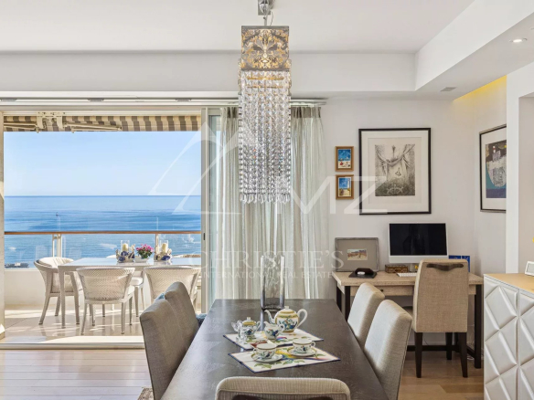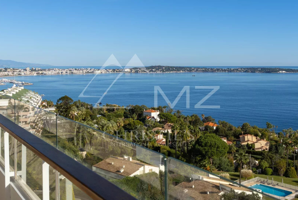 This corner apartment, located on a high floor, spans approximately 138 square meters and is distinguished by its spacious, light-filled living room, opening onto a 47-square-meter corner terrace with breathtaking panoramic views of the Mediterranean Sea. The absence of overlooking neighbors ensures complete privacy, while the parquet flooring and high-quality contemporary finishes add a touch of elegance.