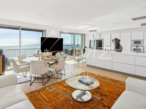 Perched on the 10th and 11th floors, this apartment, in excellent condition, boasts a bright living room and a modern, sleekly designed open-plan kitchen, all extending onto a terrace with breathtaking panoramic sea views. The first floor comprises a large bedroom and an office, which could be converted into an additional bedroom if desired.