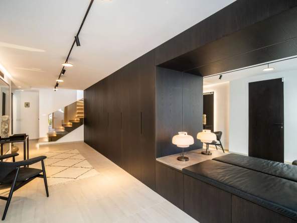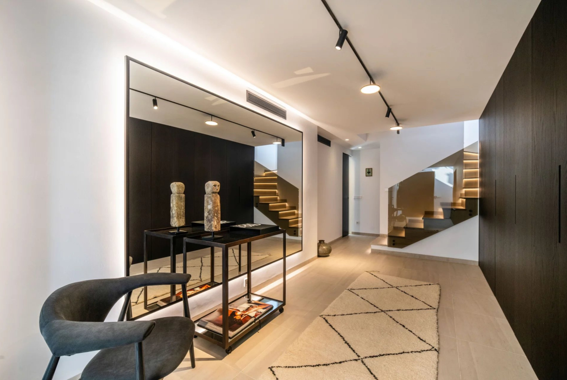 Inside, modern design meets meticulous attention to detail, with an exquisite entrance hall leading to a magnificent staircase that connects the levels. The interior palette is both tasteful and contemporary, complemented by high-end furnishings that exude comfort and style. The bespoke kitchen, equipped with top-of-the-range appliances, is a culinary paradise for aspiring chefs and gourmets alike.