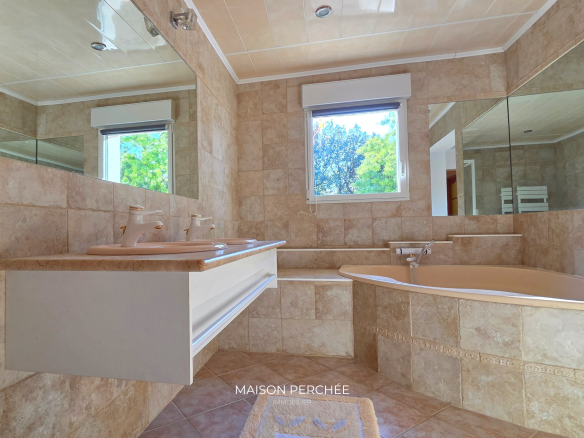 To the south, large bay windows open onto a sheltered terrace, a swimming pool with an infinity spa, and relaxation areas where one can imagine summer afternoons in the shade of the pool house. Further on, the pétanque court and outdoor shower extend this holiday atmosphere.
