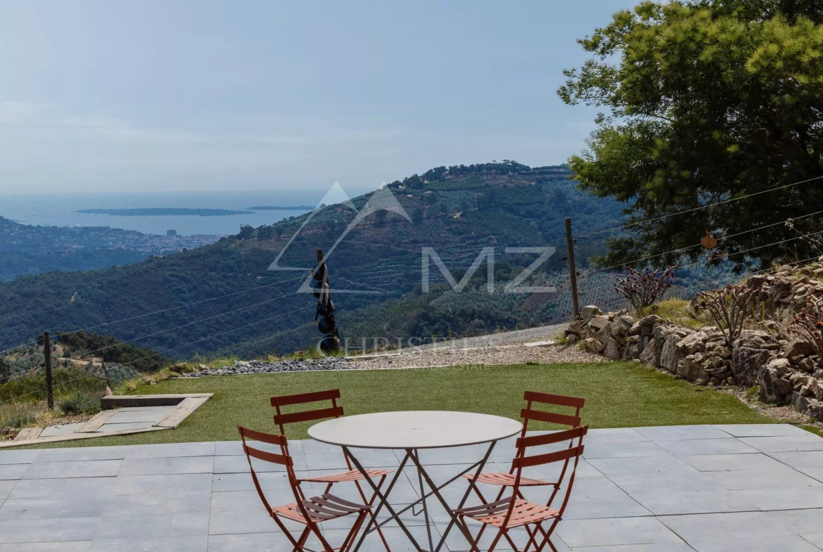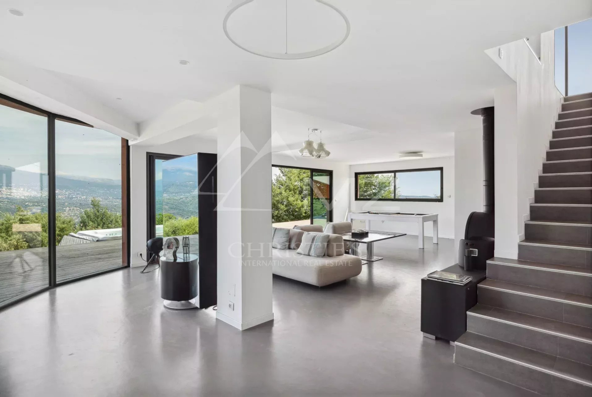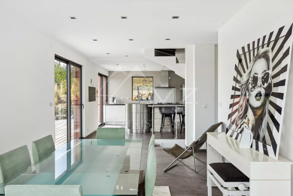 Co-exclusive. 15 minutes from Mandelieu, in a natural setting with panoramic views from the mountains to the sea, this contemporary-style house features a spacious living space with large bay windows to take advantage of its exceptional setting. The interior offers four bedrooms, including a master bedroom, all with en-suite bathrooms. On the garden level, a second, spacious living room opens onto a wooden terrace and a swim spa. A room that can be converted into an office or bedroom, a laundry room, a garage, and plenty of outdoor parking complete the features of this unique property.