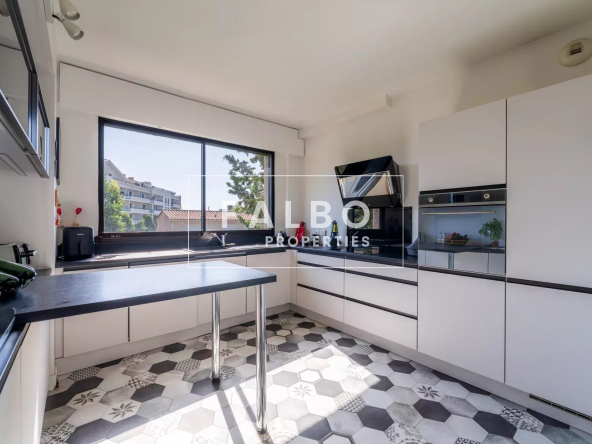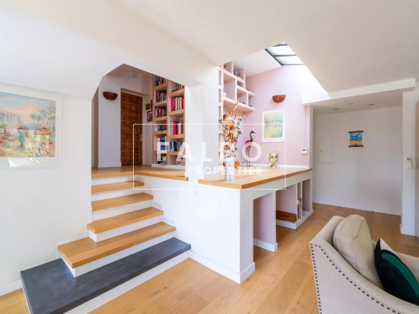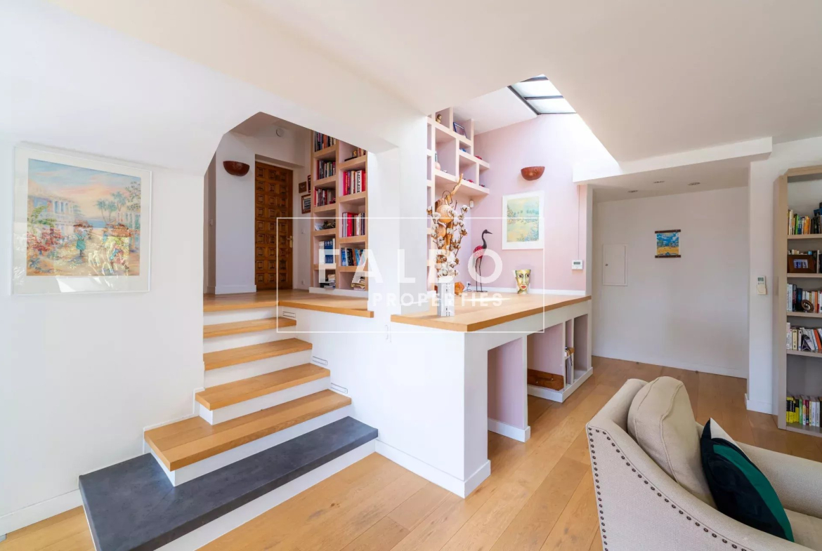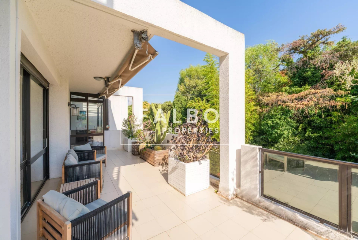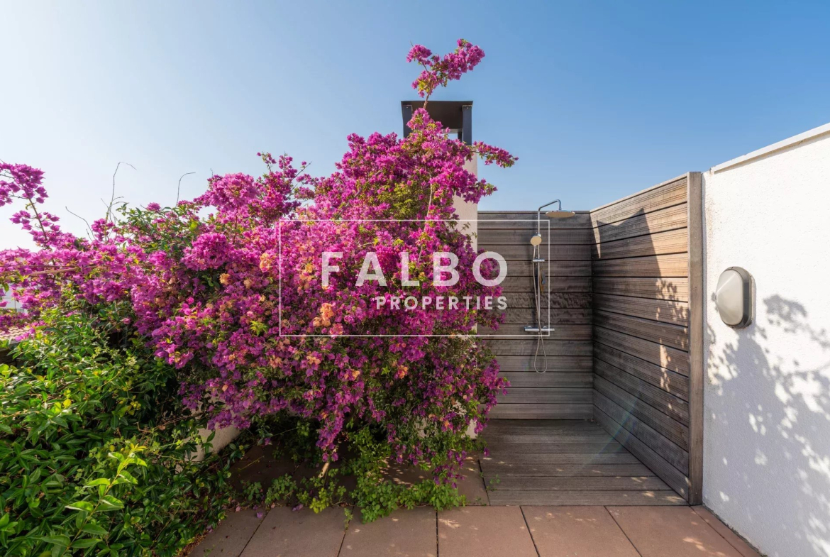 Superb semi-duplex apartment of 145 m² in Carrez law with equipped kitchen, large living room of 63m² and its fireplace extended by a first terrace, 4 bedrooms, including a master suite with dressing room, 3 shower rooms. The 45m² roof terrace is fitted with an adjoining summer kitchen, southern exposed and offers a sea glimpse. This is a particularly pleasant, very bright house, in absolute calm and surrounded by trees, without vis-à-vis.