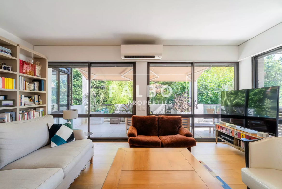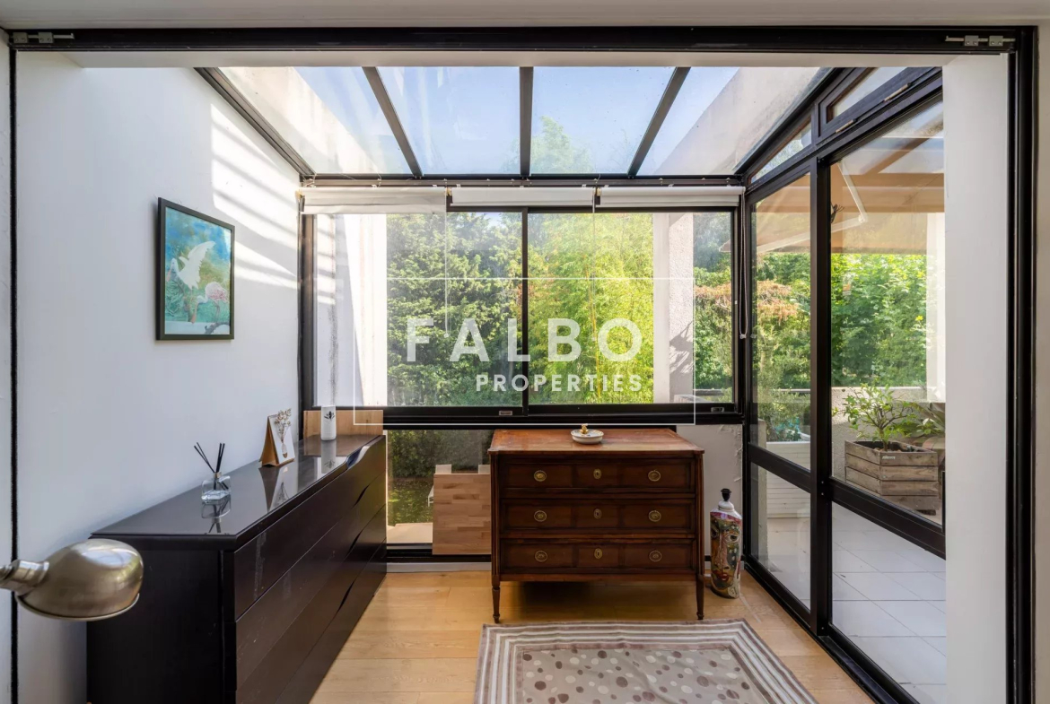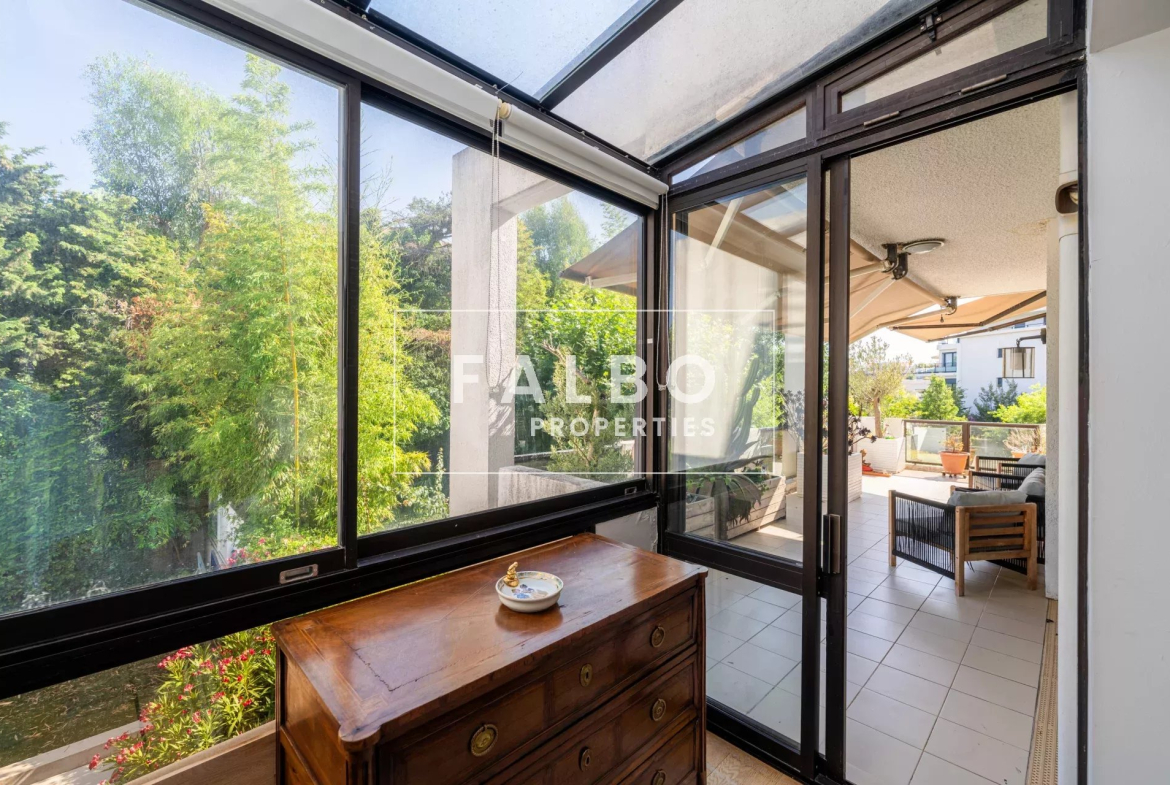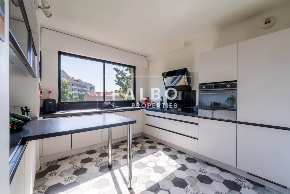 Superb semi-duplex apartment of 145 m² in Carrez law with equipped kitchen, large living room of 63m² and its fireplace extended by a first terrace, 4 bedrooms, including a master suite with dressing room, 3 shower rooms. The 45m² roof terrace is fitted with an adjoining summer kitchen, southern exposed and offers a sea glimpse. This is a particularly pleasant, very bright house, in absolute calm and surrounded by trees, without vis-à-vis.