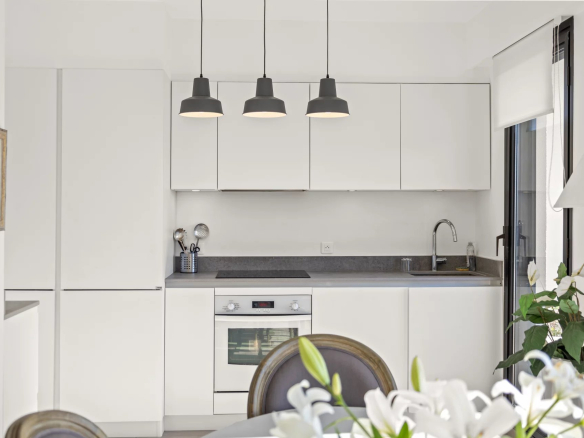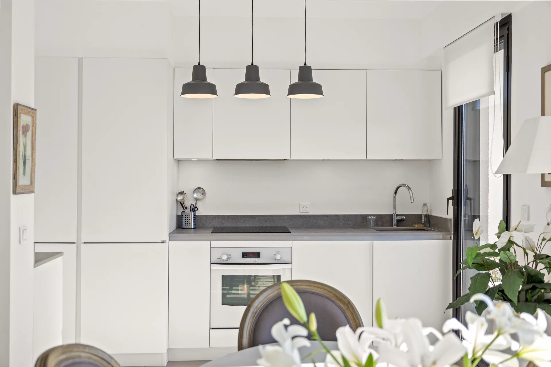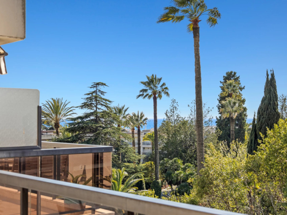 The entrance, furnished with a study area, leads to a bright, air-conditioned living room with a dining area and a fully equipped open-plan kitchen. This living space extends onto a pleasant 14.51 m² southwest-facing terrace, offering unobstructed views of the park and a glimpse of the sea.