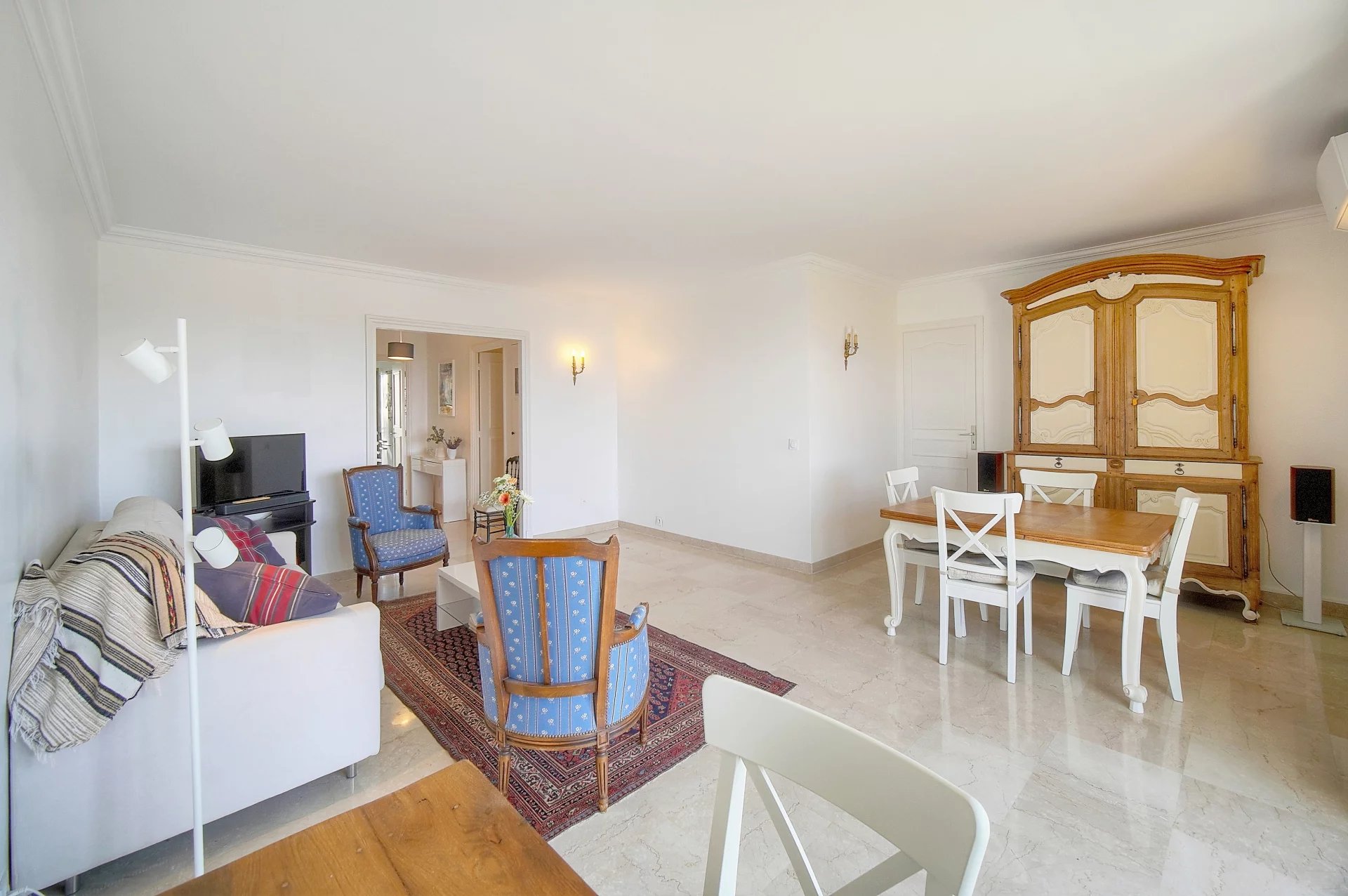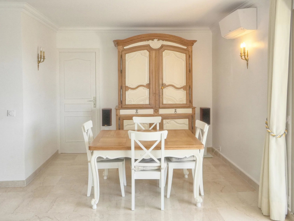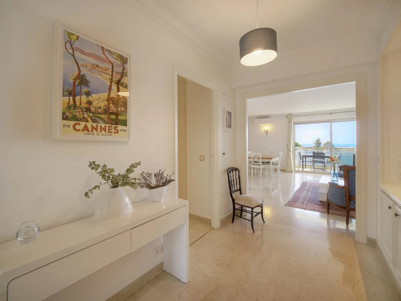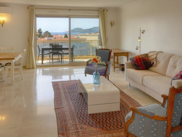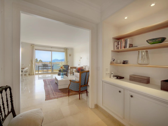 From the moment you enter, you'll be captivated by a spacious, light-filled living and dining room opening onto a large south-facing terrace. Enjoy unobstructed and spectacular views of the sea, the landscaped park with its olive trees, and the Esterel mountains.