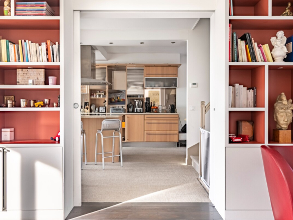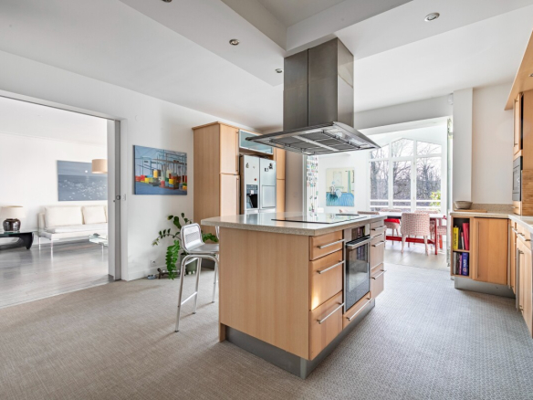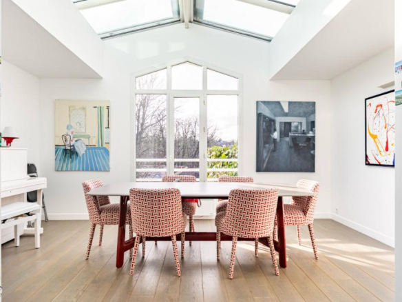 On the first floor, the living and dining room with an open-plan kitchen create a spacious 68 sq m living area, opening directly onto the terrace and garden.