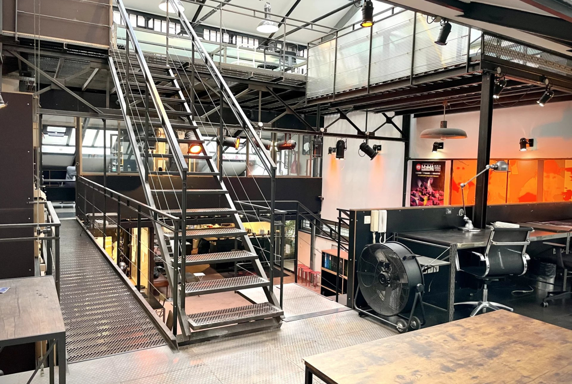 A fully steel staircase leads to two 69m2 mezzanines facing each other, connected by a walkway.