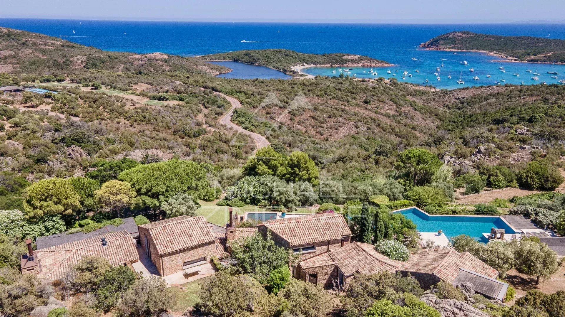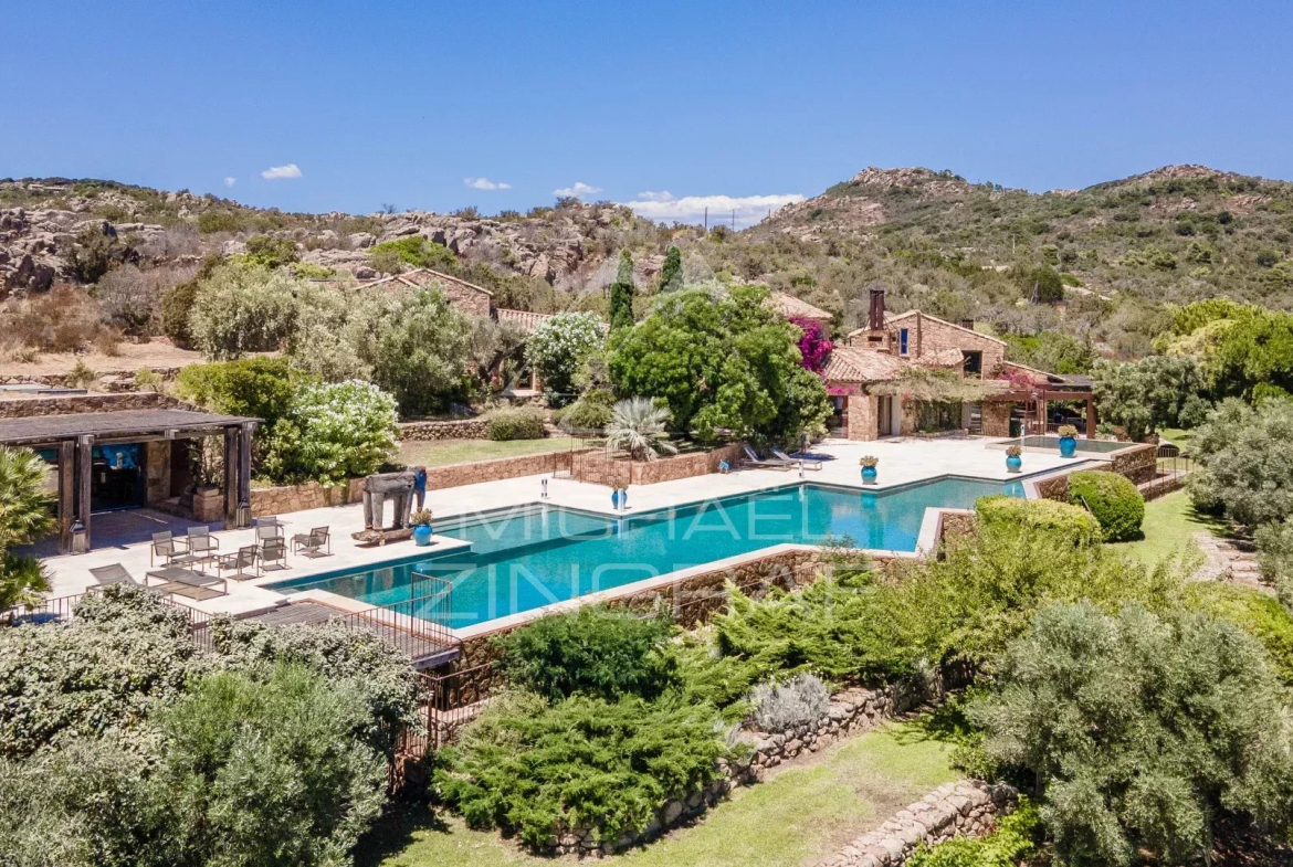 Facing Rondinara Bay, repeatedly voted the most beautiful beach in France and Europe, this unique property offers a picture-perfect setting: fine, light-colored sand, crystal-clear waters, and endless shades of turquoise blue. Nestled in the heart of the maquis shrubland, in a pristine natural environment dotted with purple rocks, it is accessed via a charming little path leading to an exceptional residence set on 2.8 hectares of land.