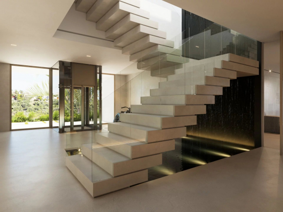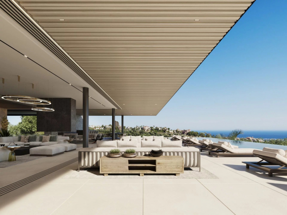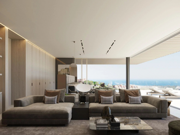 Designed to redefine the concept of indoor/outdoor living, the entire ground floor opens fully onto terraces, where residents can enjoy comfortable relaxation areas and al fresco dining while taking in the breathtaking panoramic views of the sea, mountains, and Mediterranean coastline. The stunning infinity pool, gracefully nestled in a corner of the property, adds an enchanting touch to the outdoor experience.