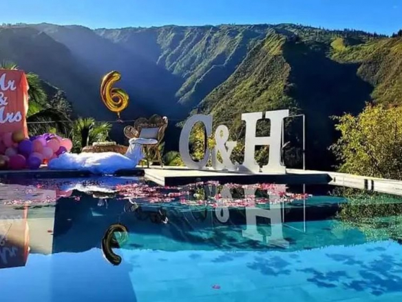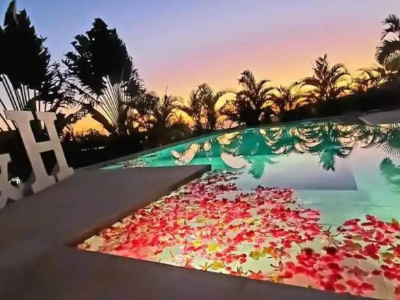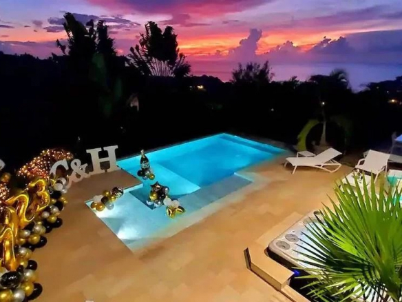 The 120-square-meter pool area offers breathtaking views of the Matatia waterfalls and includes a 6-7 person jacuzzi.