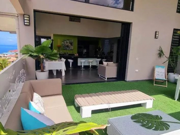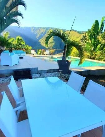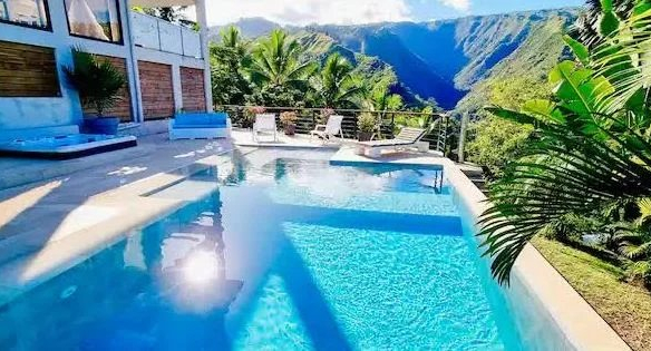 – 1 large kitchen (7-meter high ceiling), 1 living room, 1 bedroom with ensuite bathroom, guest toilet, 1 pantry of 18 square meters, 2 terraces: one overlooking the Matatia Valley, the other overlooking the sea and Moorea;