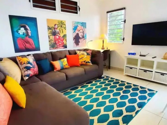 – On the basement: 1 one-bedroom apartment with a living room/kitchen, a bathroom with washing machine, and a terrace overlooking Moorea and the pool.