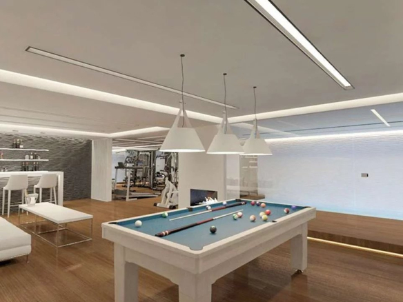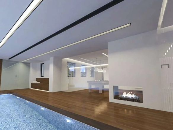 The games room level (159 m²) consists of a large room which is planned to accommodate several facilities such as a gym, sauna and a 15 m² heated indoor swimming pool, as well as staff accommodation and a kitchenette.