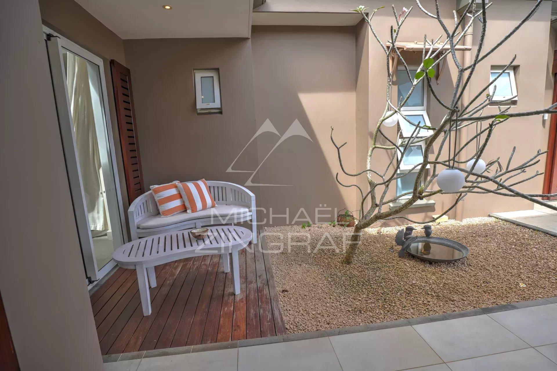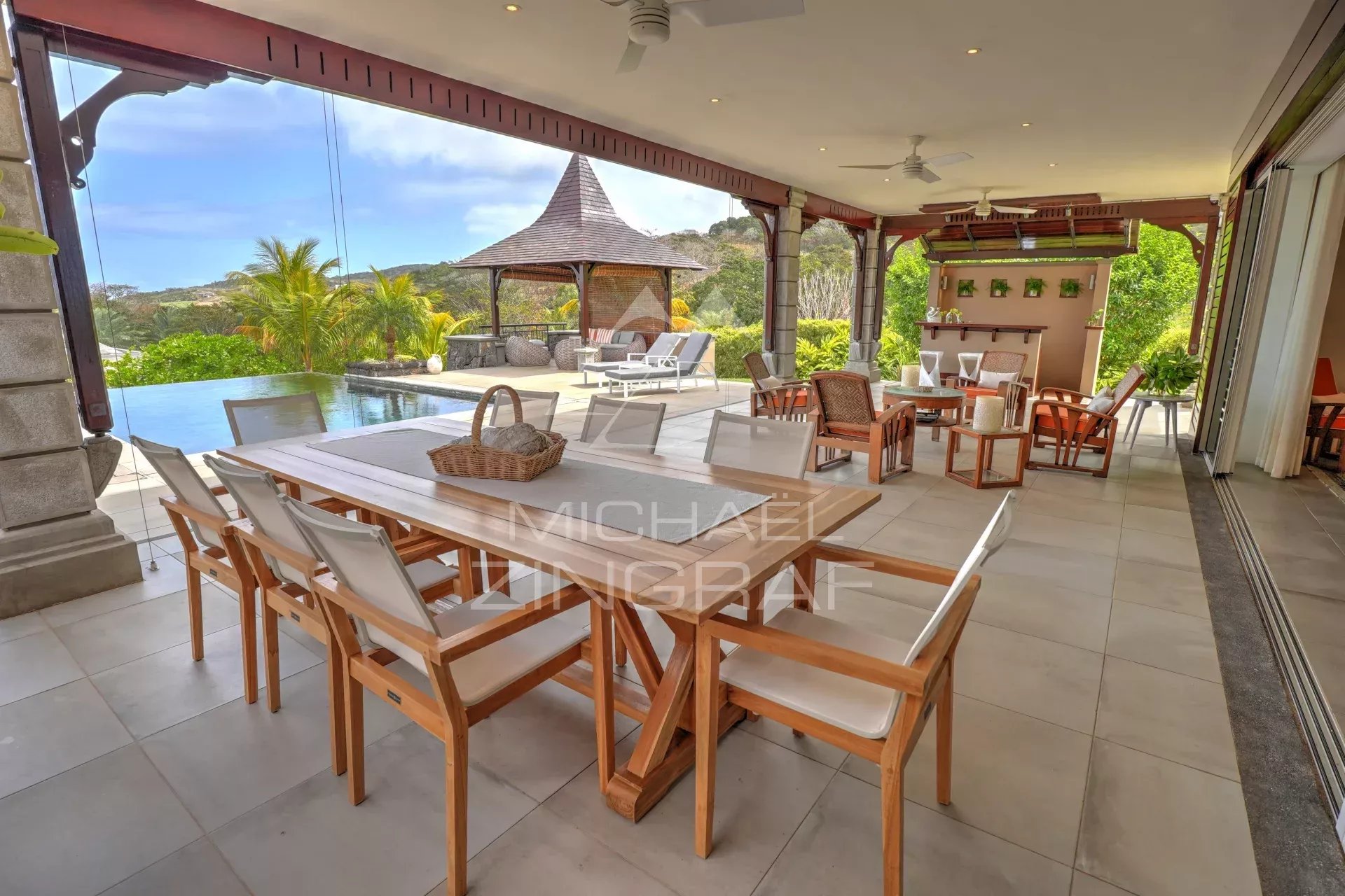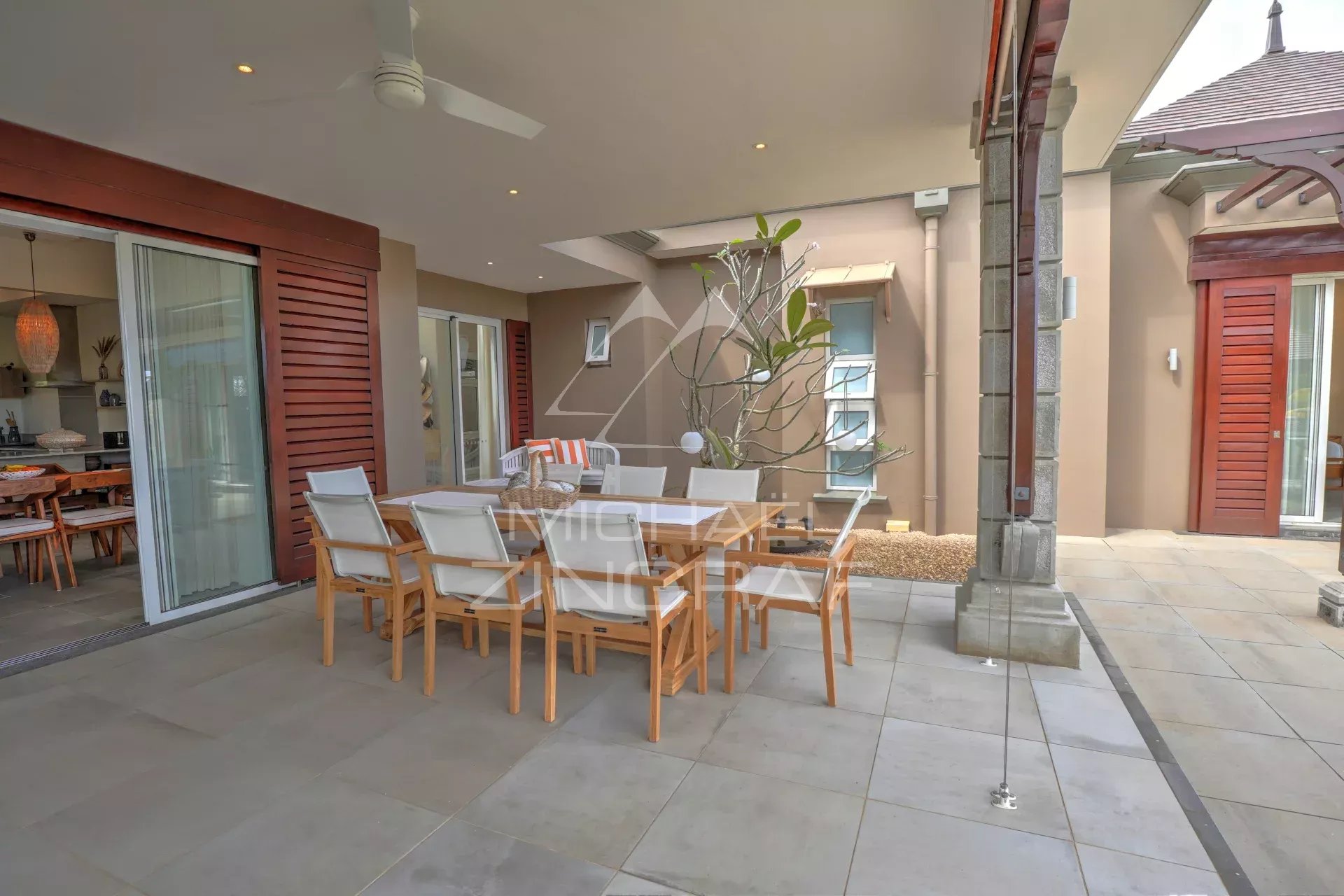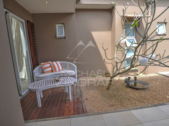 The four en-suite bedrooms are true sanctuaries of comfort, with the master bedroom opening onto an outdoor shower and bathtub, perfect for relaxing amidst nature. Each bedroom is equipped with centralized air conditioning, ensuring optimal comfort in every season.