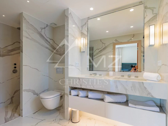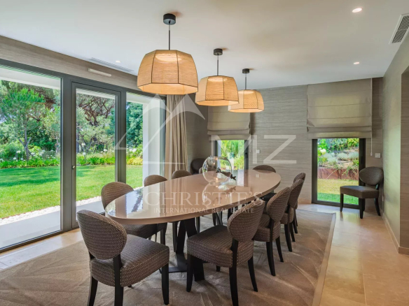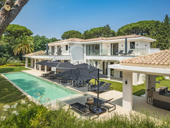 Beautiful contemporary villa in the secure Parcs de Saint Tropez estate, offering lovely interior living spaces including a living room, dining room, fully equipped kitchen, 6 en suite bedrooms including a master suite with its own terrace, a massage room with a hammam, and a gym.