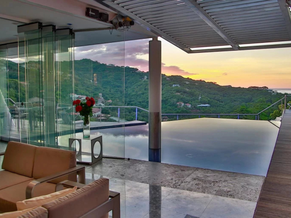 📋 MAIN FEATURES — Bedrooms: 8 • Bathrooms: 8 • Infinity pool + teak walkway • Multi-level terraces • Private verandas (most bedrooms) • Floor-to-ceiling glass walls • Guest house: full kitchen + living room + dining room • Accessible garden suite • Honeymoon suite: glass wall with bay view • Modern fully equipped kitchen • Panoramic Pacific and mountain views • Location: Playa Ocotal • Playa Flamingo area • Guanacaste • Costa Rica.