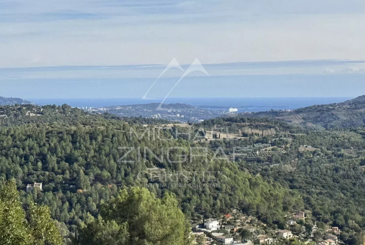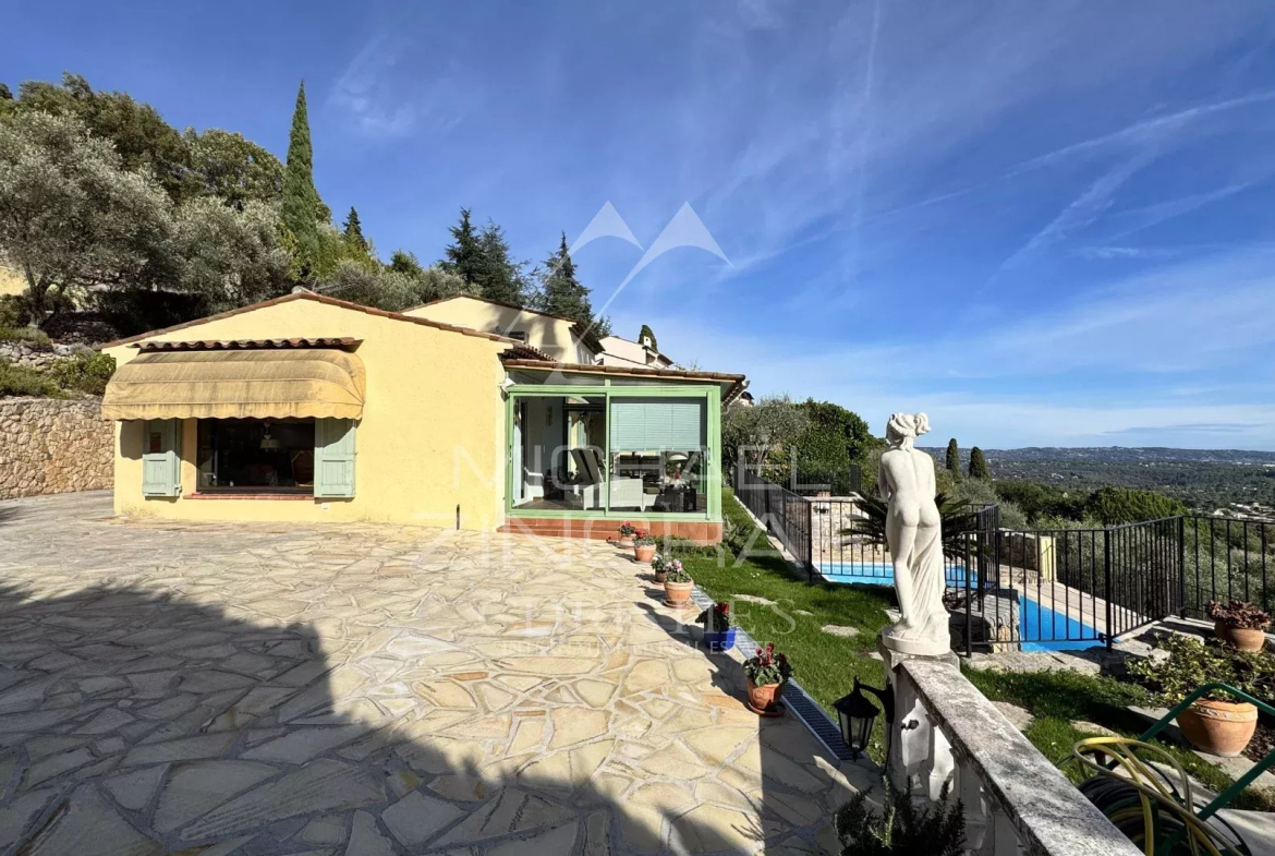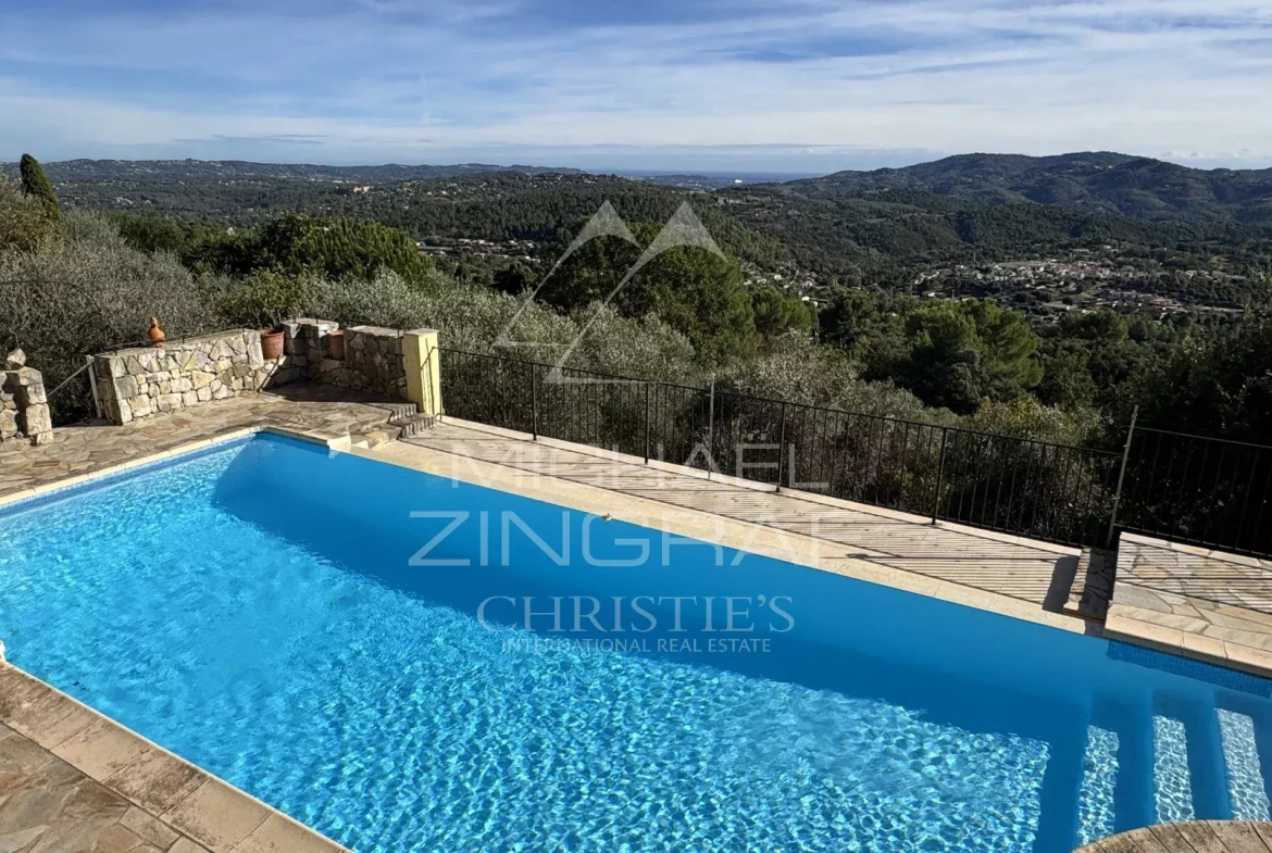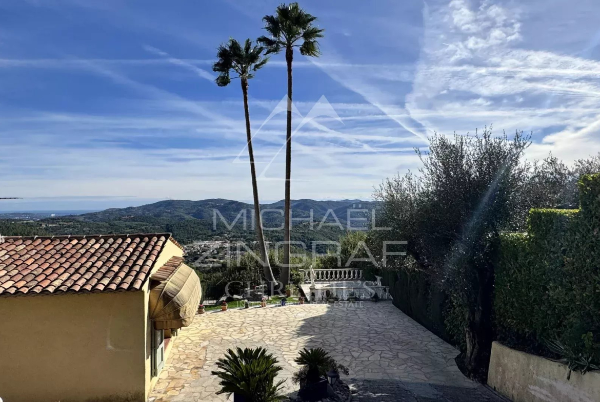 Provençal villa with a panoramic view offering you in the foreground the hinterland and in the background the sea where we can see the Lérins Islands. On the ground floor we discover a triple reception of approximately 69m² with fireplace lounge, library lounge and finally the veranda on the same level as the terrace; all overlooking a pretty swimming pool. There is also a spacious kitchen on the same level, the "master" suite, its bathroom and the amenities (laundry room, guest toilet, etc.). The first floor offers two bedrooms and a shower room. In addition to the exceptional view, you will discover a pretty olive grove planted with around thirty trees. A parking lot and a "pool house" area complete the whole. Special mention to the two Hollywood palm trees which watch over the bathers. Possibility of creating a fourth bedroom with shower room on the ground floor. We are at the crossroads of the charming villages of Cabris, Saint Cézaire, Spéracèdes and Le Tignet while remaining close to Cannes (25 mins), Nice (40 mins), Grasse (10 mins), but also the Verdon (40 mins) If you are looking for authenticity, you are there: it is a perfect mix of Provence and Riviera.