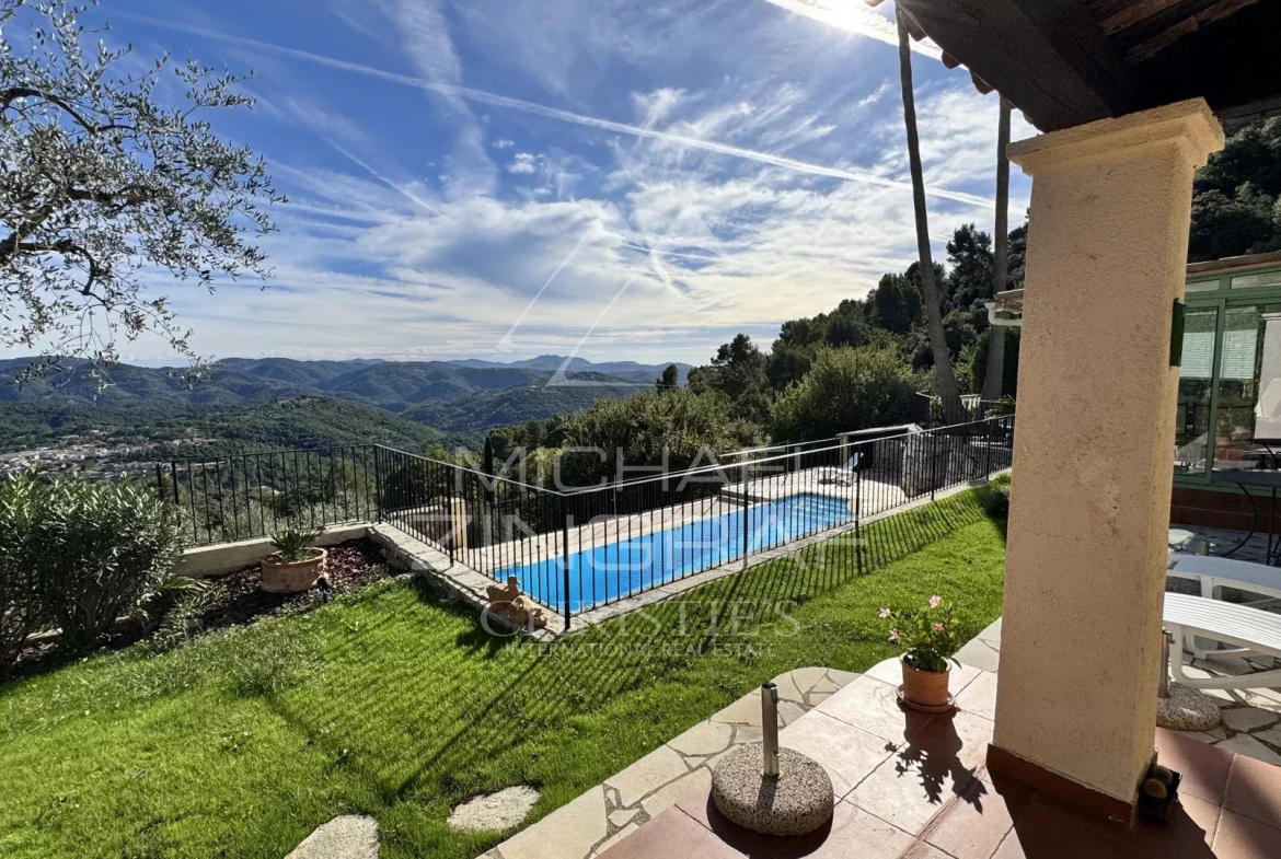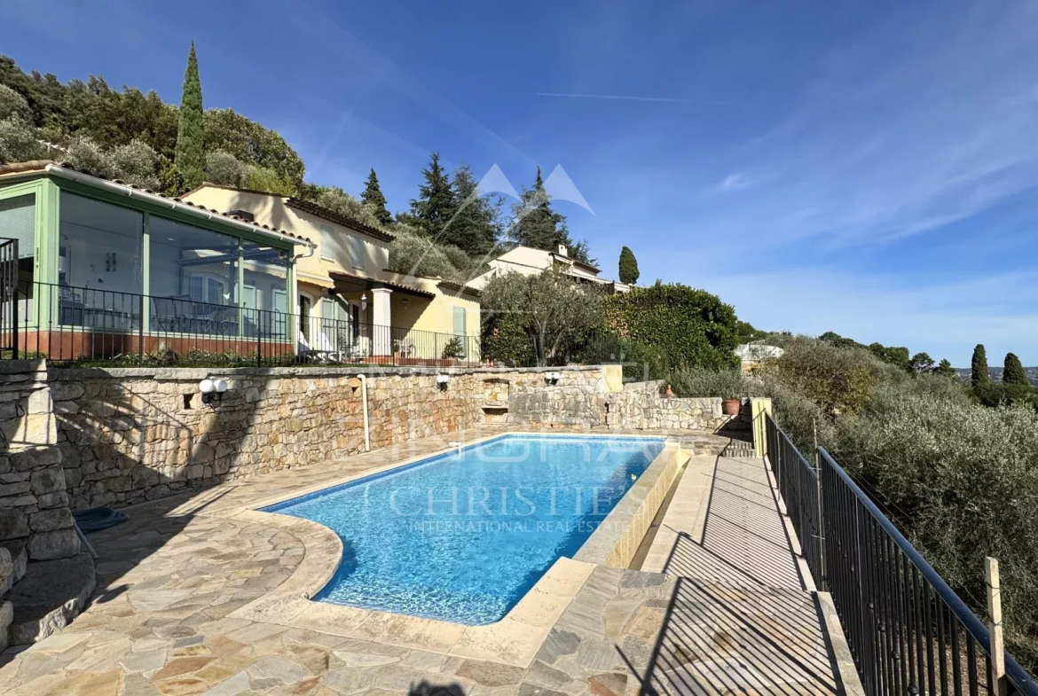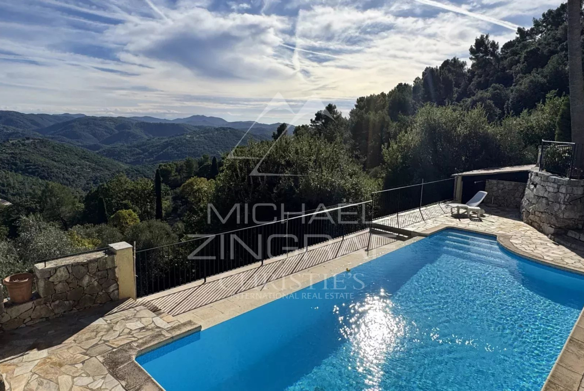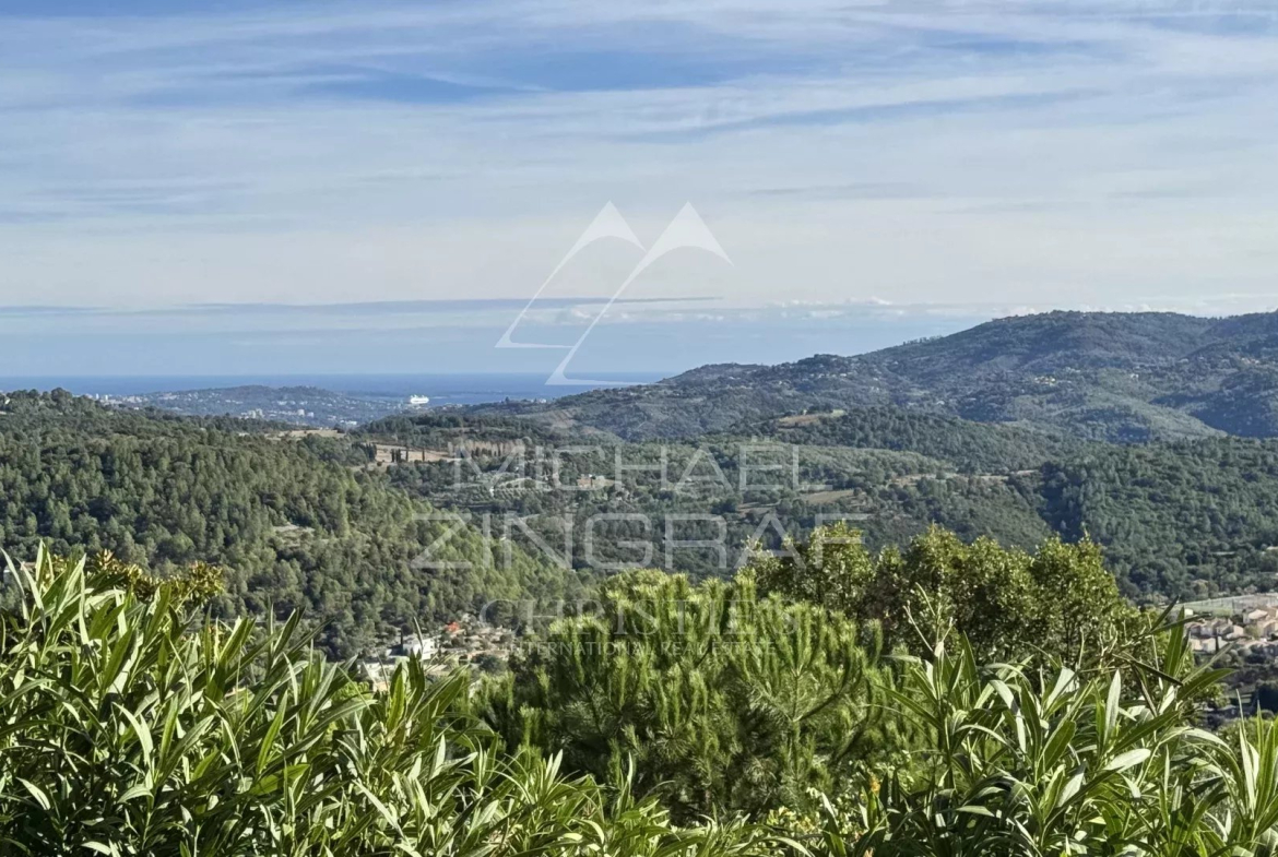 Provençal villa with a panoramic view offering you in the foreground the hinterland and in the background the sea where we can see the Lérins Islands. On the ground floor we discover a triple reception of approximately 69m² with fireplace lounge, library lounge and finally the veranda on the same level as the terrace; all overlooking a pretty swimming pool. There is also a spacious kitchen on the same level, the "master" suite, its bathroom and the amenities (laundry room, guest toilet, etc.). The first floor offers two bedrooms and a shower room. In addition to the exceptional view, you will discover a pretty olive grove planted with around thirty trees. A parking lot and a "pool house" area complete the whole. Special mention to the two Hollywood palm trees which watch over the bathers. Possibility of creating a fourth bedroom with shower room on the ground floor. We are at the crossroads of the charming villages of Cabris, Saint Cézaire, Spéracèdes and Le Tignet while remaining close to Cannes (25 mins), Nice (40 mins), Grasse (10 mins), but also the Verdon (40 mins) If you are looking for authenticity, you are there: it is a perfect mix of Provence and Riviera.