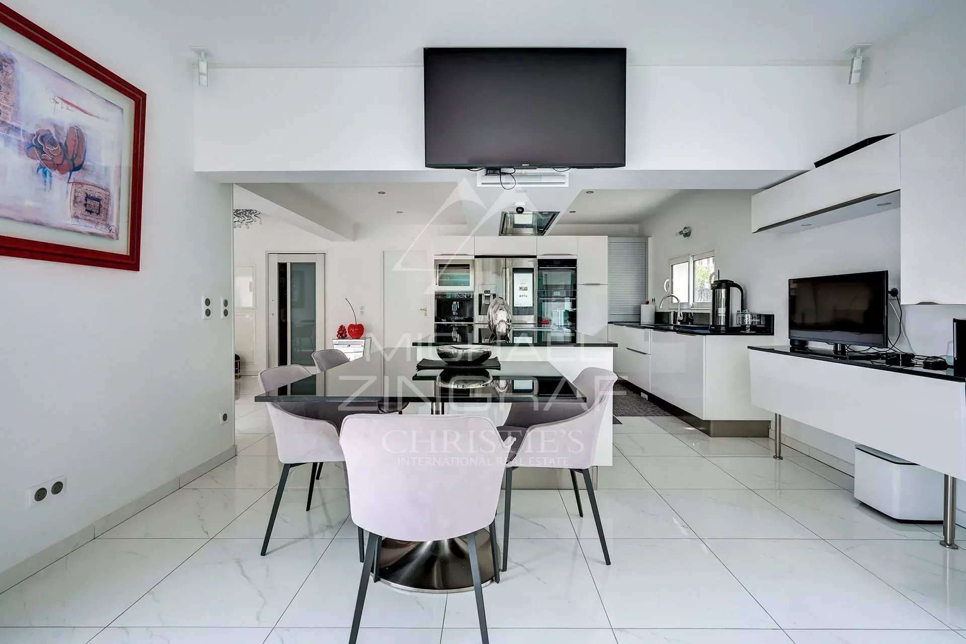 Upstairs, the master suite, accessible by elevator, is a real cocoon of serenity: spacious bedroom, private living room, two custom dressings and a refined bathroom with double shower and WC. An independent office completes this space, while the adjoining terraces roofs offer a breathtaking view of the garden.