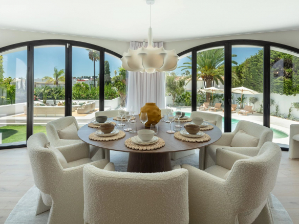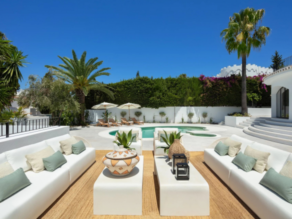 This captivating villa impresses with its unique architectural design, featuring a domed structure at the heart of its exterior façade. Its white walls and traditional Andalusian tiles add a touch of classic charm. The property boasts a variety of outdoor terraces, perfect for al fresco dining, barbecues, and relaxation, allowing residents to enjoy Marbella's pleasant climate year-round. Surrounded by lush vegetation, the villa ensures maximum privacy from neighboring properties. The distinctive shape of the swimming pool, connected to a jacuzzi, adds visual appeal.