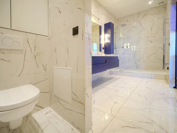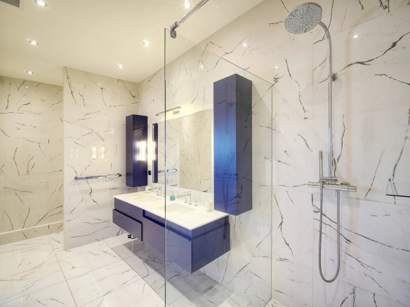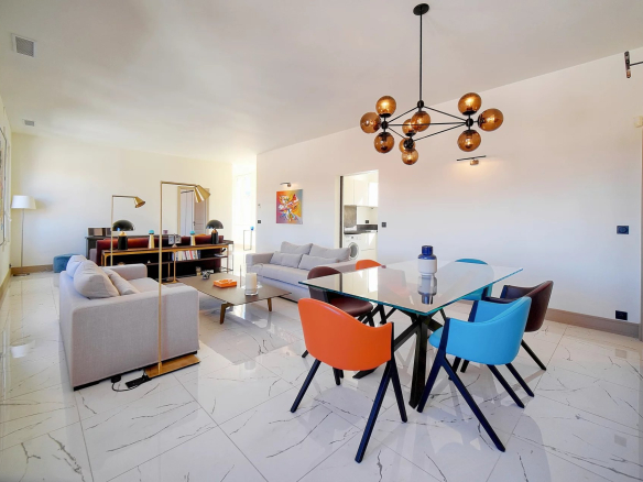En étage élevé, l’appartement s’ouvre sur un large hall d’entrée menant à un vaste séjour / salle à manger de 45 m², baigné de lumière et offrant une superbe vue sur le Suquet. La cuisine semi-séparée, entièrement équipée, allie design et fonctionnalité.
