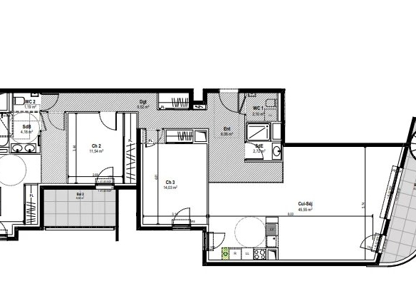 Offrant une exposition Sud-Est, cet appartement lumineux dispose d’un vaste séjour avec cuisine ouverte de 46 m², trois chambres, une salle de bains, une salle d’eau, et des WC séparés.