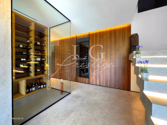 Le rez-de-chaussée se compose d’une entrée, d’un vaste séjour/cuisine équipée d’environ 100 m² ouvrant sur la terrasse et la piscine à débordement, d’un cellier, d’une buanderie, de toilettes invités, d’une chambre avec dressing et salle d’eau/wc. Le tout desservi par de beaux dégagements et finitions soignées.