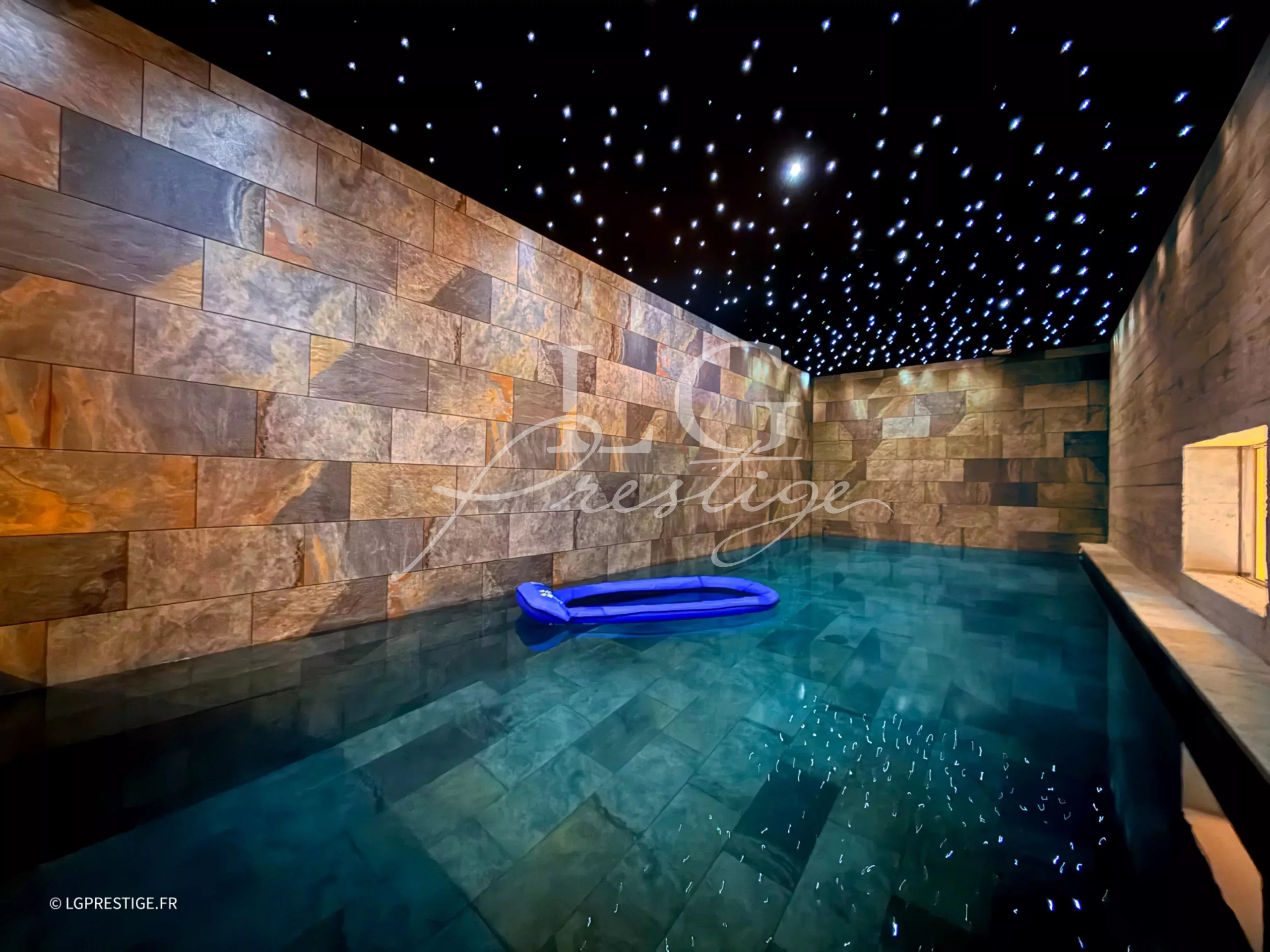 L’étage accueille 4 chambres, dont plusieurs suites avec salle d’eau ou salle de bains, des dressings, et un grand dégagement. Vous y trouverez aussi une salle de cinéma entièrement équipée de 24 m² pour des soirées en famille, ainsi qu’une piscine intérieure chauffée pour votre sport quotidien.