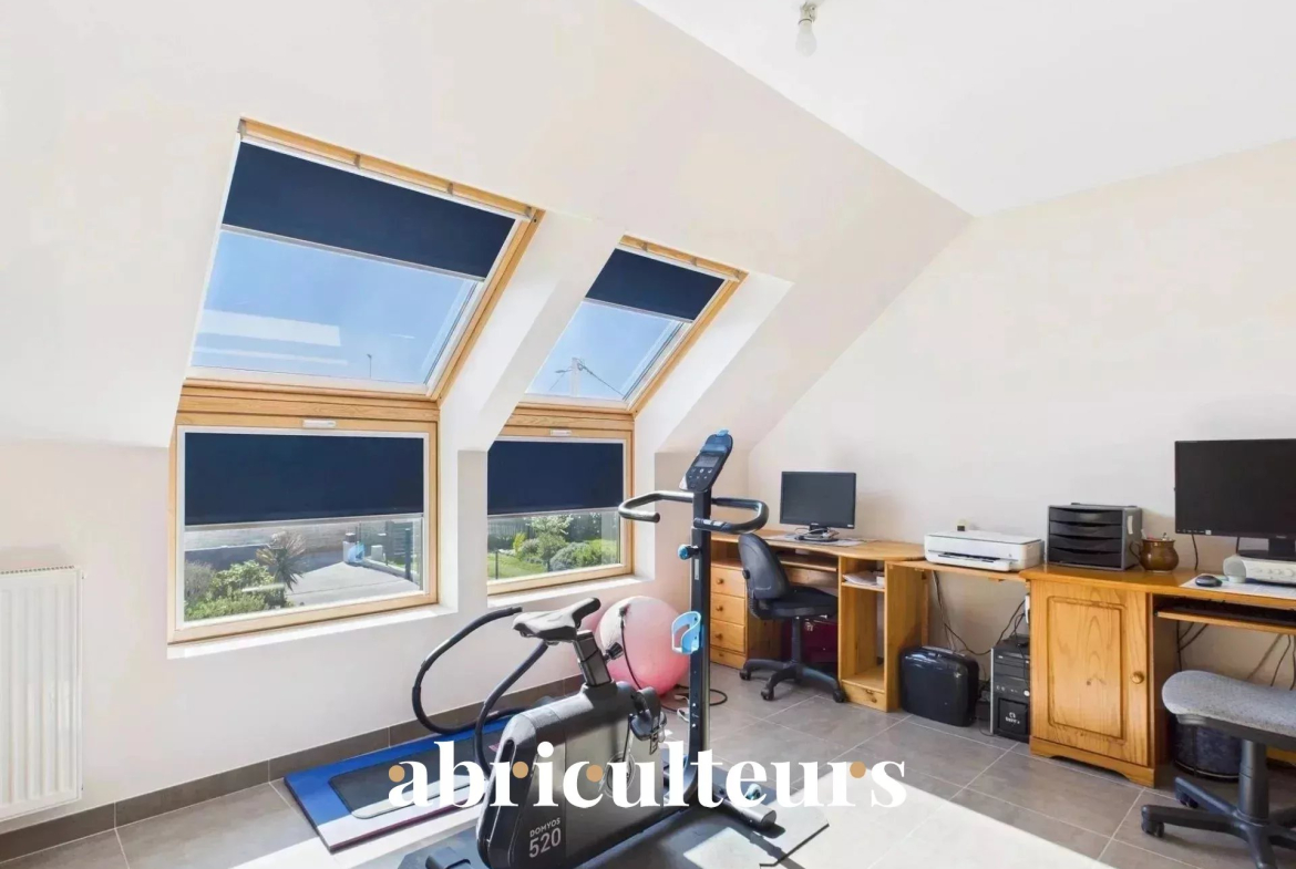 Le rez-de-chaussée s’ouvre sur un grand espace de vie lumineux tourné vers la terrasse, comprenant un salon avec poêle à bois, une salle à manger conviviale et une cuisine ouverte entièrement équipée. Ce niveau propose également une suite parentale avec dressing, salle de bain et toilettes, une chambre pouvant faire office de bureau, une arrière-cuisine/buanderie spacieuse ainsi qu’un double garage atelier avec grenier.