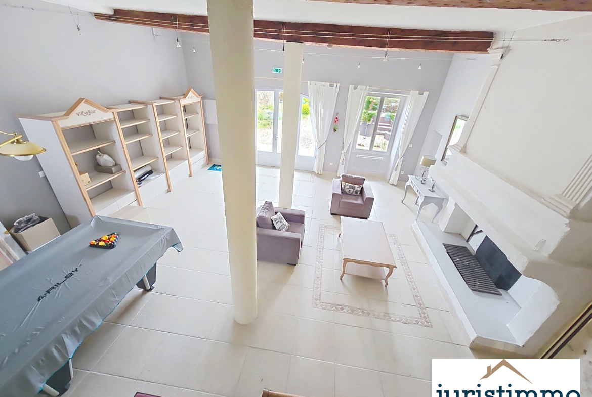 Le second espace, plus intime, s’organise autour d’un grand logement indépendant à l’étage, avec une vaste pièce de vie baignée de lumière, une cuisine ouverte, une mezzanine et plusieurs chambres nichées sous les toits.