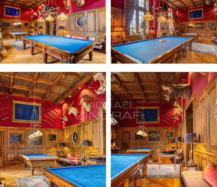 La salle de billard accueille une splendide cheminée incarnent à merveille l’esprit luxueux et chaleureux du château.