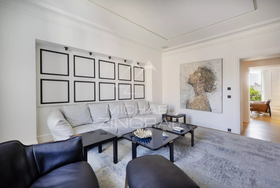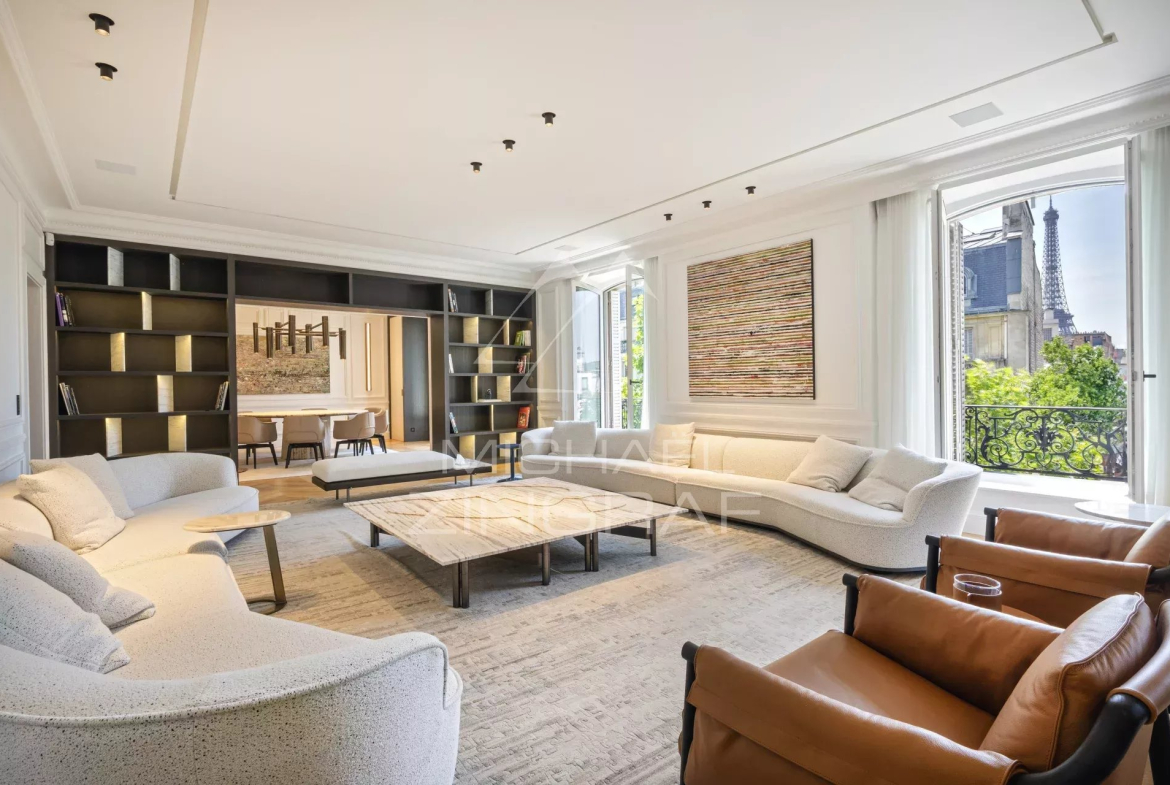 Le premier niveau se compose d’un double salon bénéficiant en partie d’une vue dégagée sur la Tour Eiffel, d’une salle à manger, d’un espace Family Room, d’une cuisine indépendante, d’une buanderie, de toilettes invités et de plusieurs dressings.