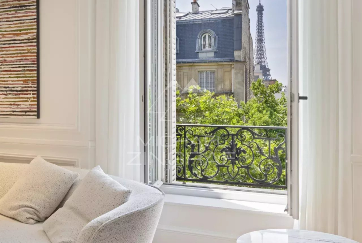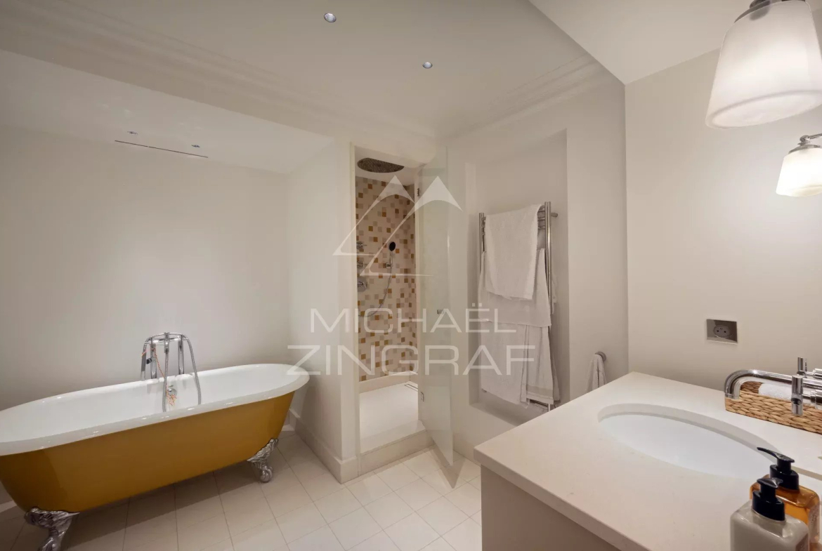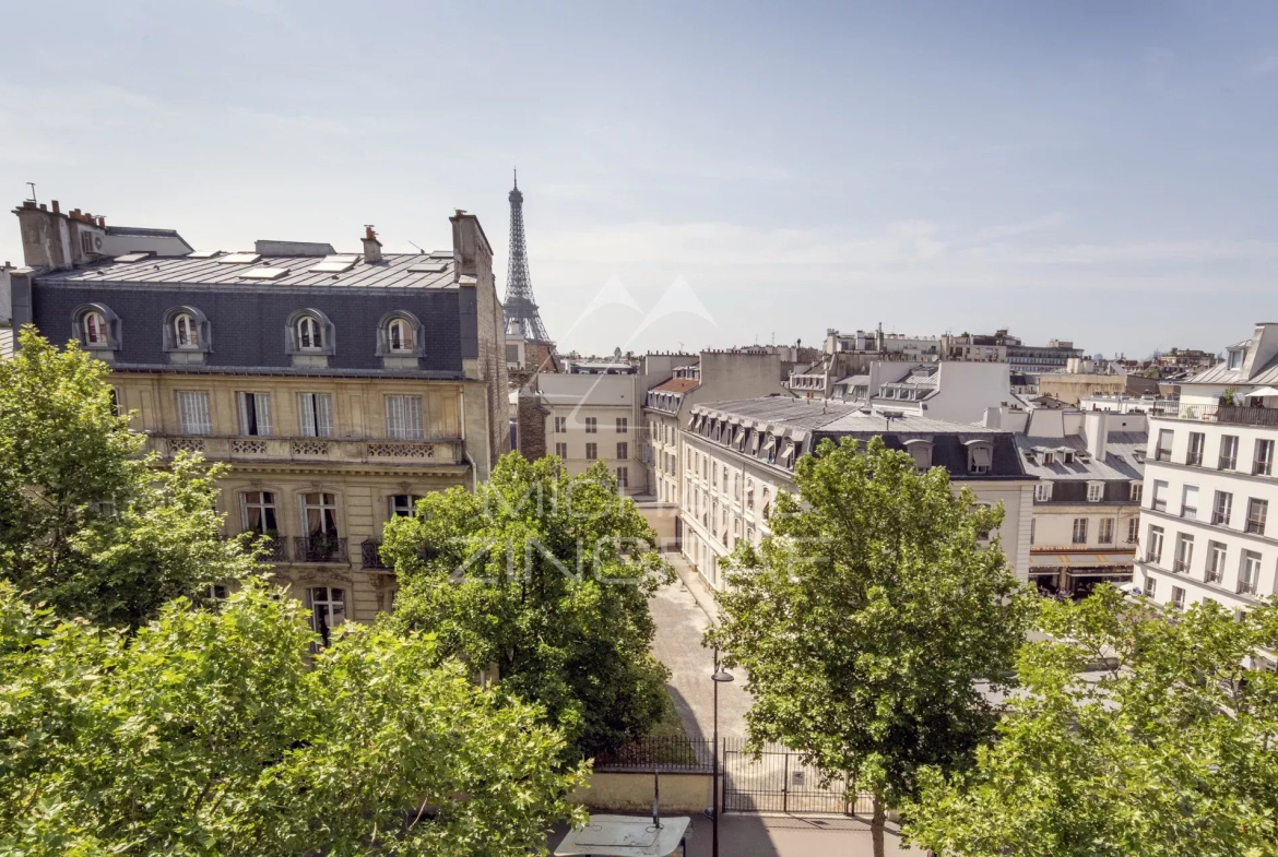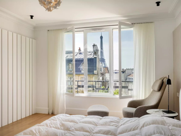 À l’étage supérieur, la suite parentale ainsi qu’une seconde chambre de type master profitent également d’une vue partielle sur la Tour Eiffel. L’étage comprend en outre une salle de bains privative, une salle de bains partagée pour deux chambres, et une chambre d’amis avec salle de douche attenante.
