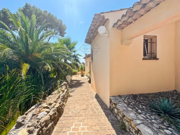 Le terrain de 2 350 m² est un véritable havre de paix : pins centenaires, citronniers, terrain de pétanque, maisonnette annexe pouvant faire office de salle de sport ou atelier d’artiste…