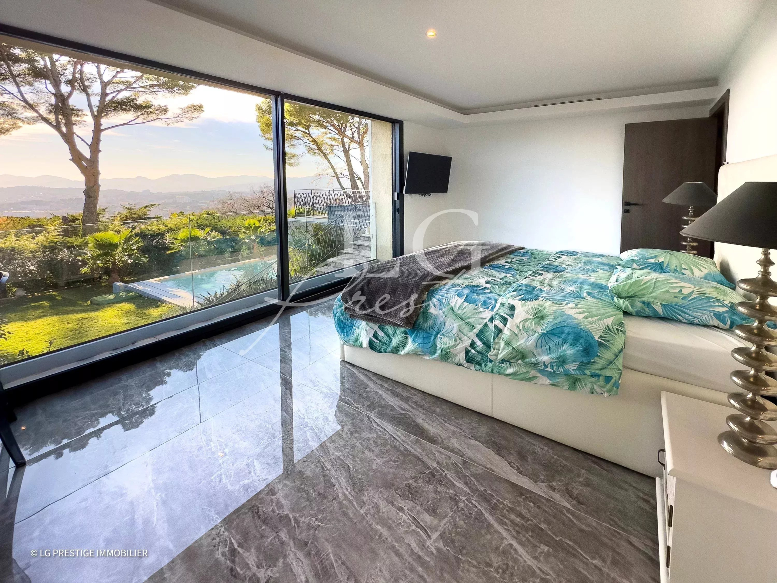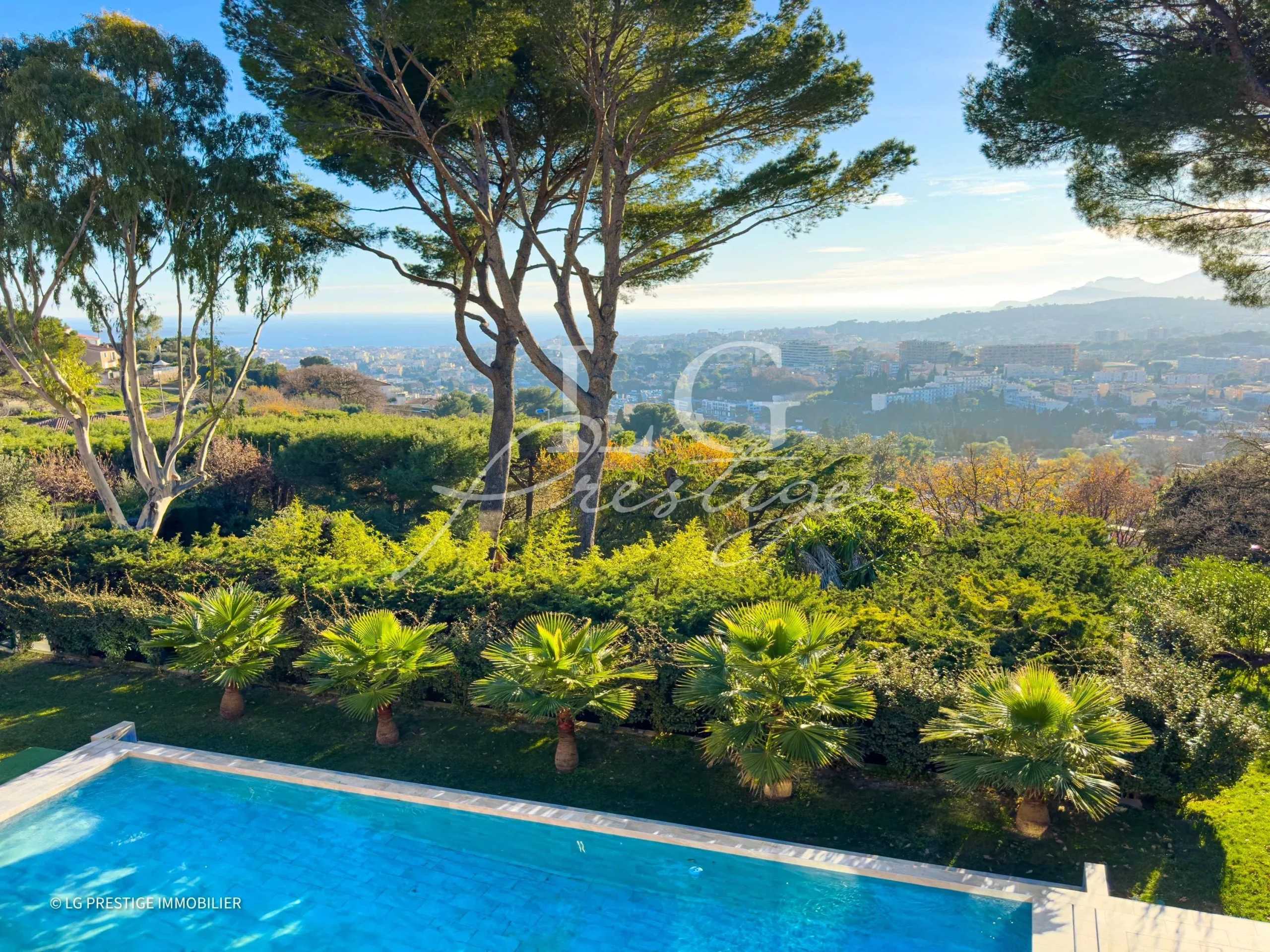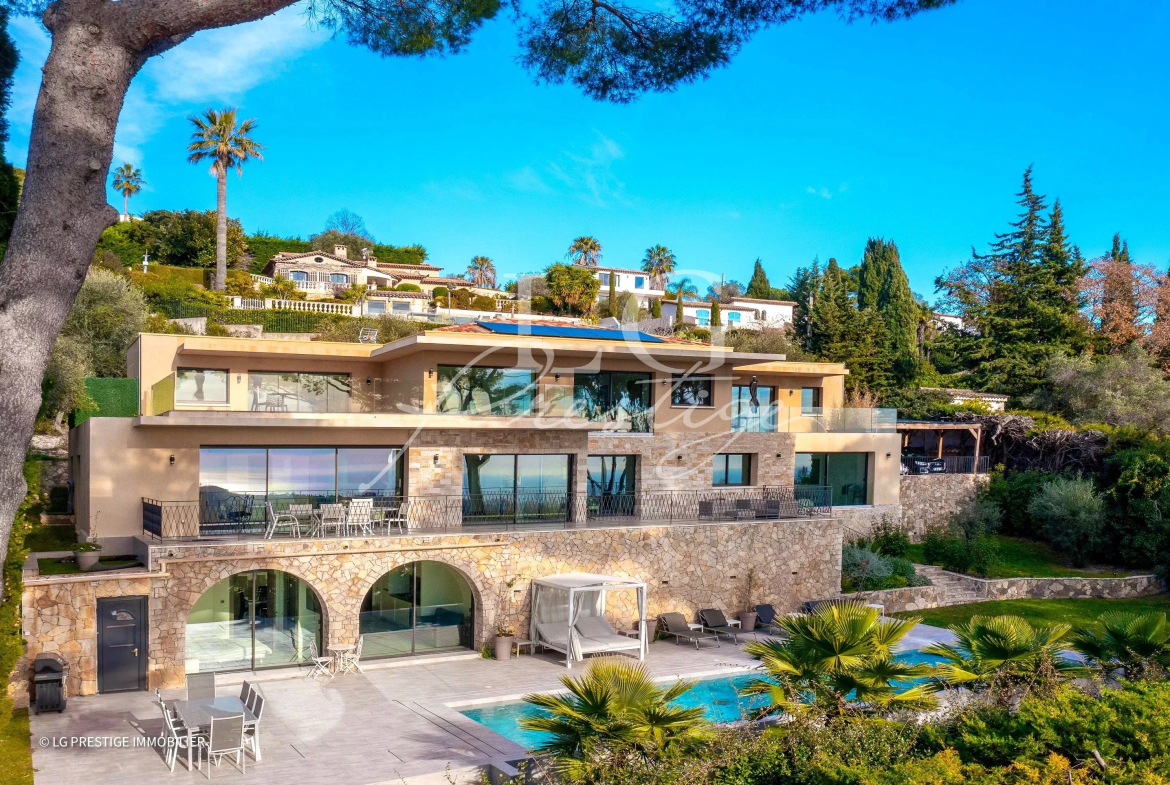 Située en position dominante et bénéficiant d’une vue mer iles de Lérins jusqu’au Massif de l’Estérel, en exposition Sud/Ouest, cette propriété baignée de lumière dispose d’un séjour/salle à manger – cuisine ouverte de 90 m2, 5 chambres en suite, une salle de cinéma, un hammam, une cave à vins.