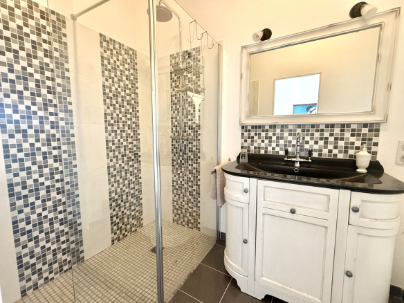 La partie gauche de la maison principale comprend deux chambres confortables, une grande salle d’eau, une buanderie, ainsi qu’une cuisine fonctionnelle ouverte sur la salle à manger. Le salon, spacieux et chaleureux avec sa cheminée en pierre, s’ouvre sur une terrasse qui mène directement à la piscine chauffée, équipée d’un système de nage à contre-courant.