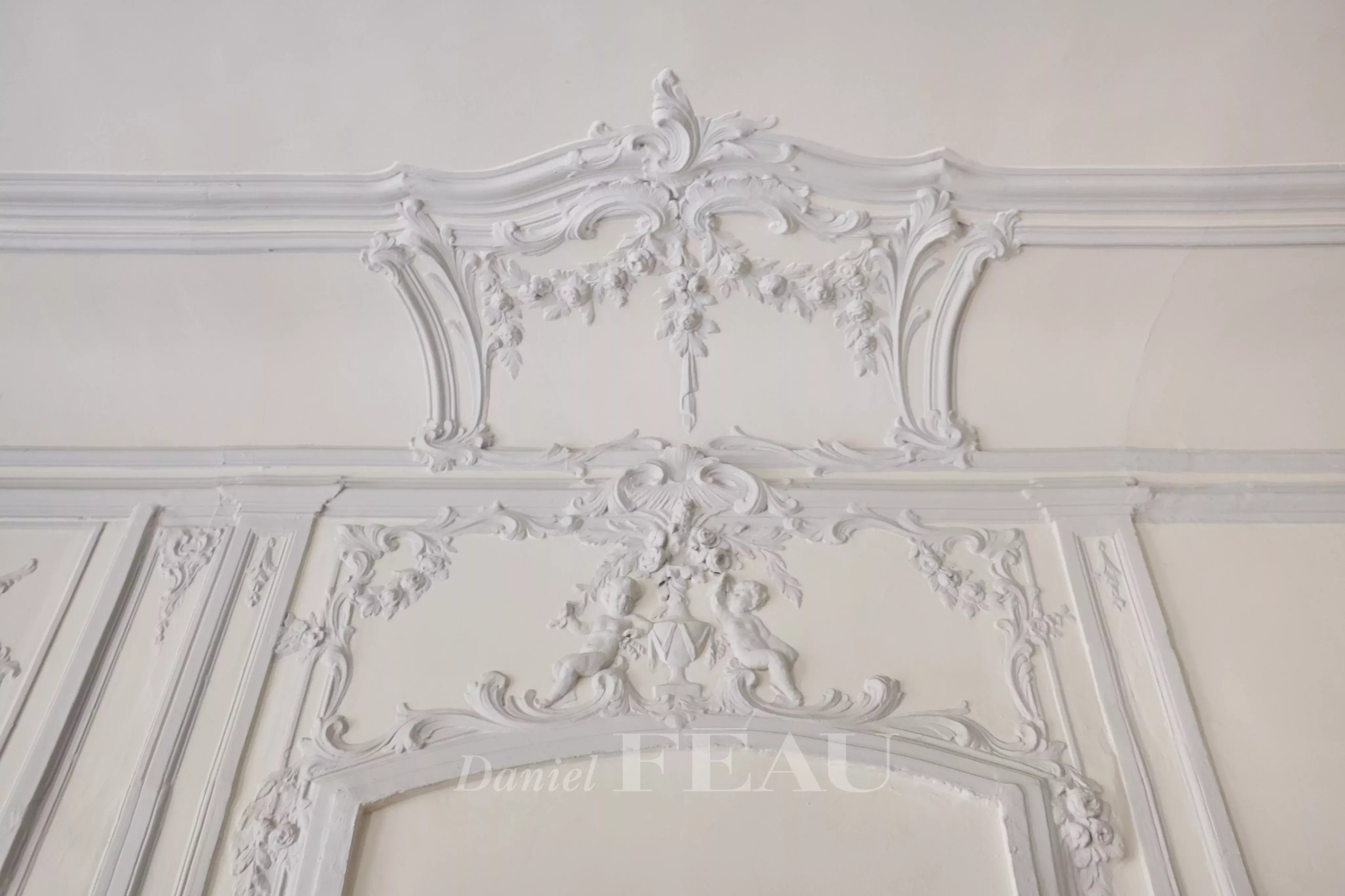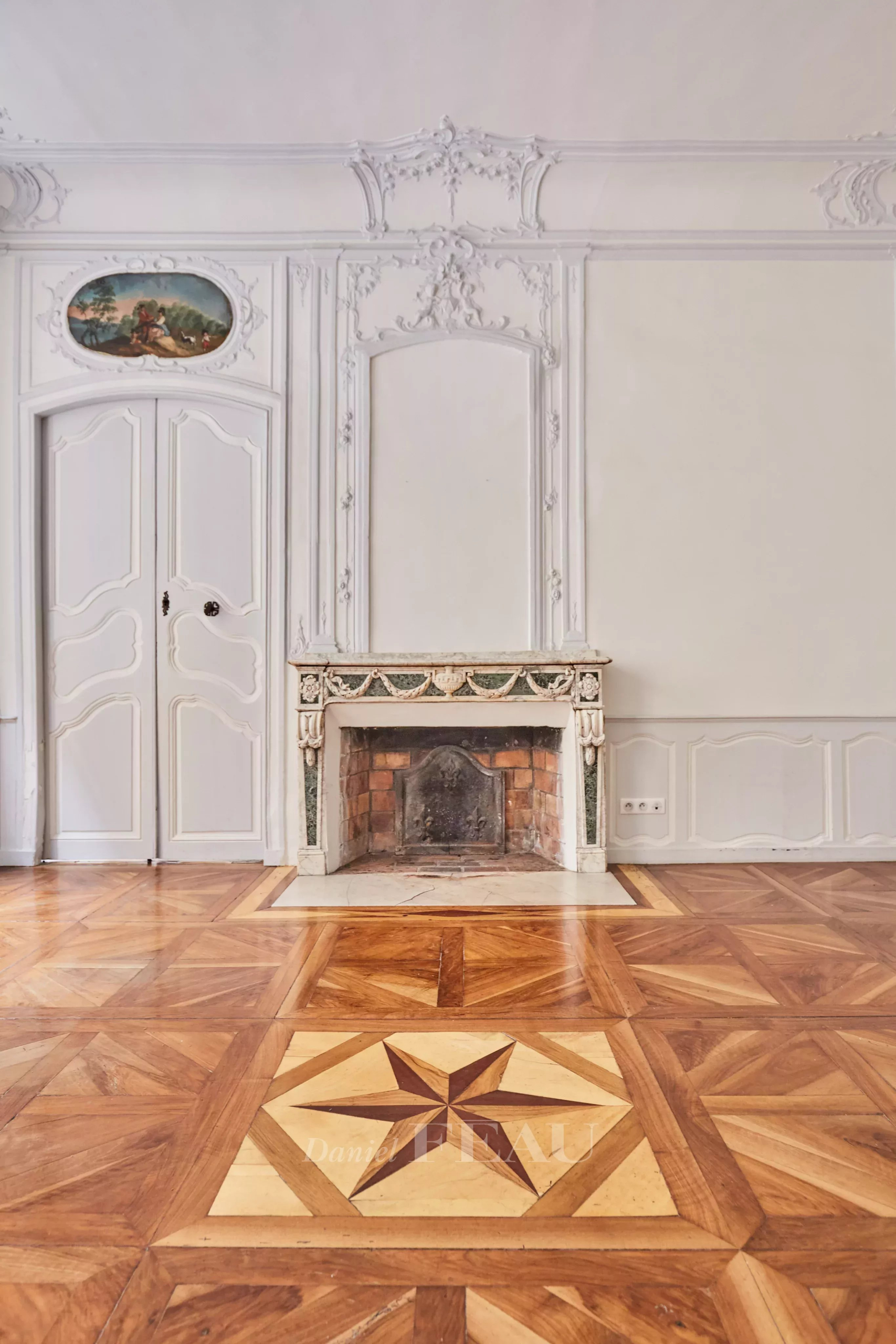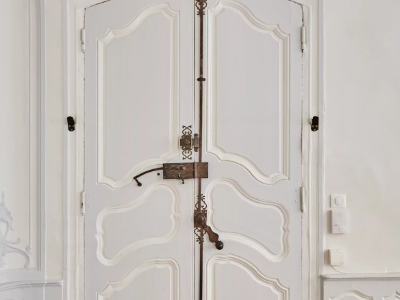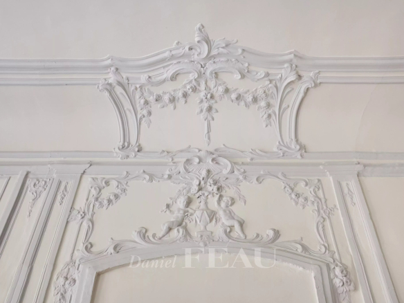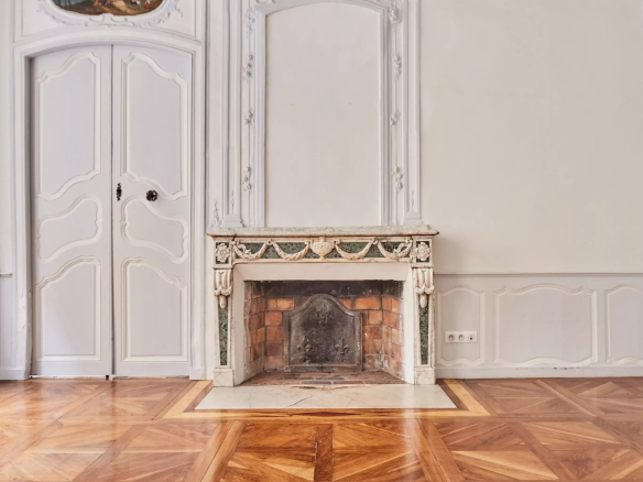 Deux portes d’entrée donnent accès à un salon baigné de lumière, aux gypseries délicates, boiseries sculptées et parquet Versailles. Les dessus de portes ornés, les volets intérieurs et les très belles hauteurs sous plafond témoignent du passé de l’immeuble.