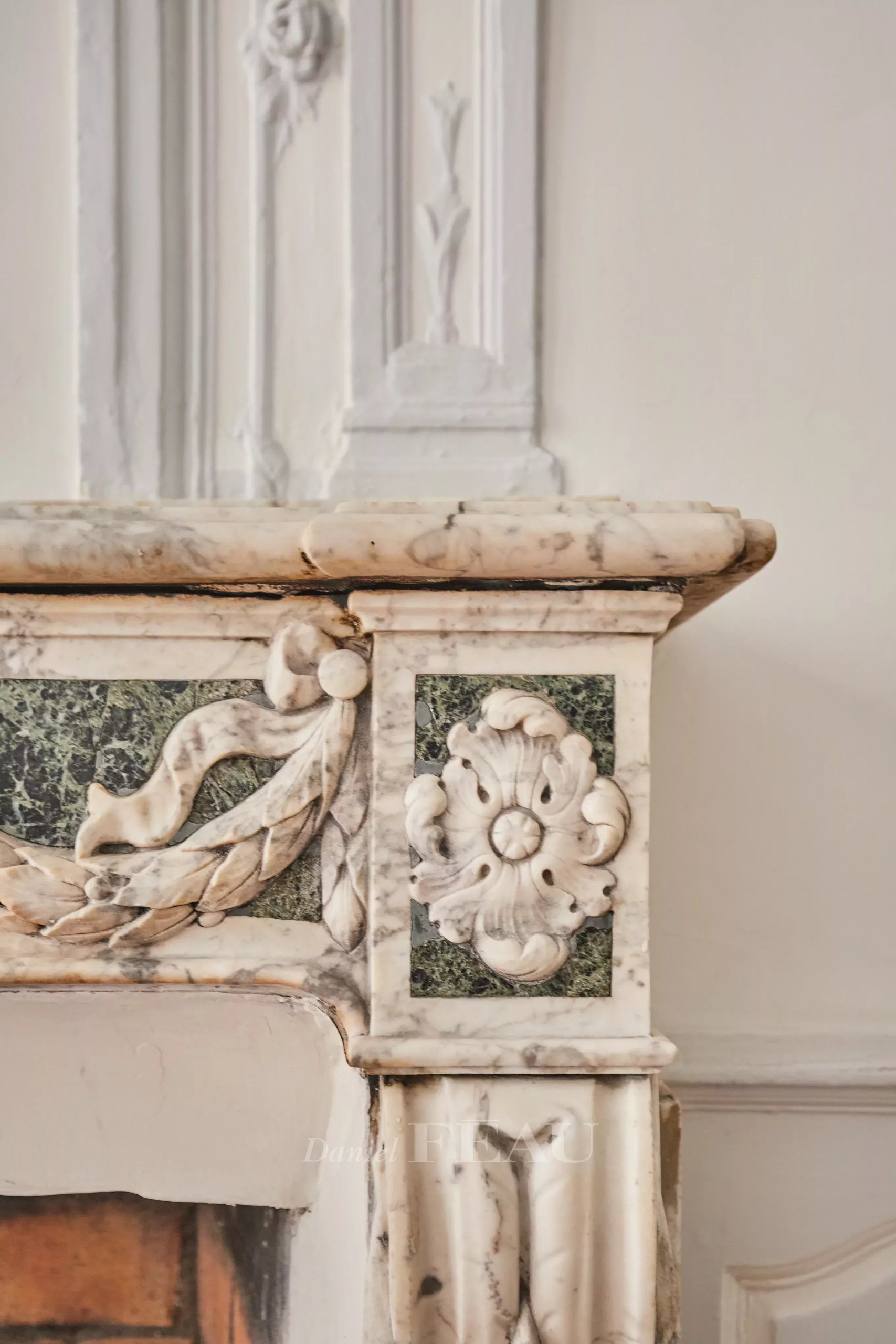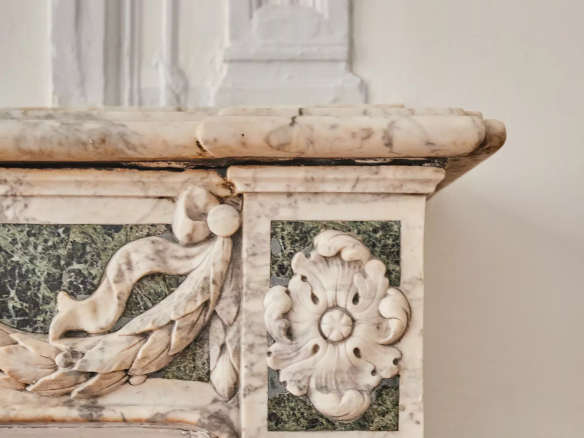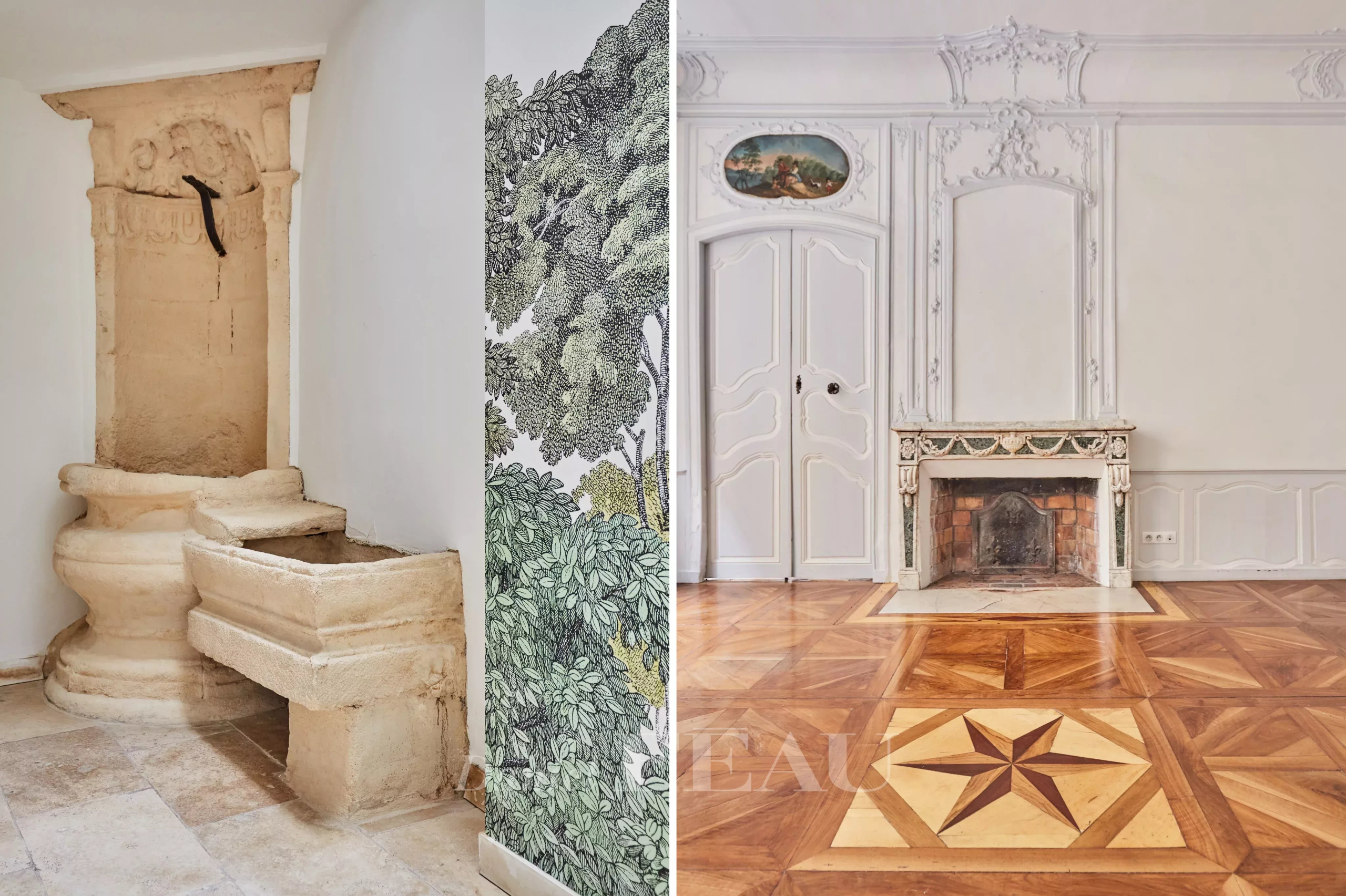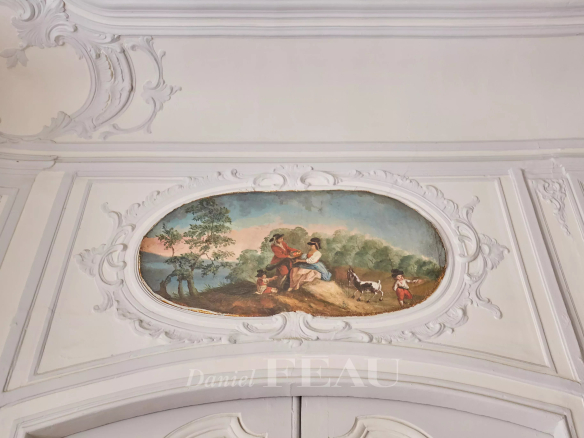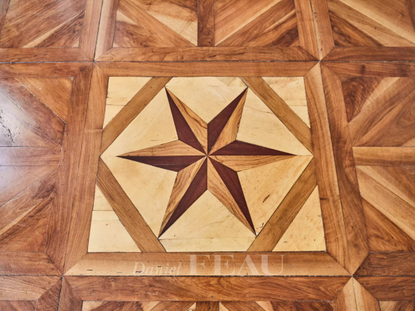 Deux portes d’entrée donnent accès à un salon baigné de lumière, aux gypseries délicates, boiseries sculptées et parquet Versailles. Les dessus de portes ornés, les volets intérieurs et les très belles hauteurs sous plafond témoignent du passé de l’immeuble.